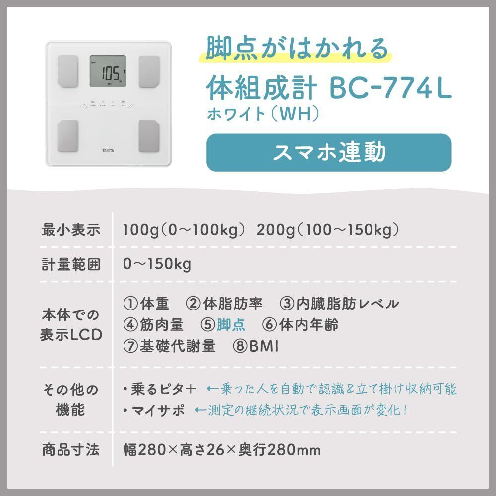 【在庫セール】タニタ 体重計 体組成計 スマホ連動【業界初 脚点判定(体重を支える足の筋肉量を点数化)】体脂肪率/筋肉量/内臓脂肪レベル/体重/体内年齢/基礎代謝量/BMI/乗るピタ/マイサポ 立て掛け収納OK ヘルスメーター BC-774L-WH