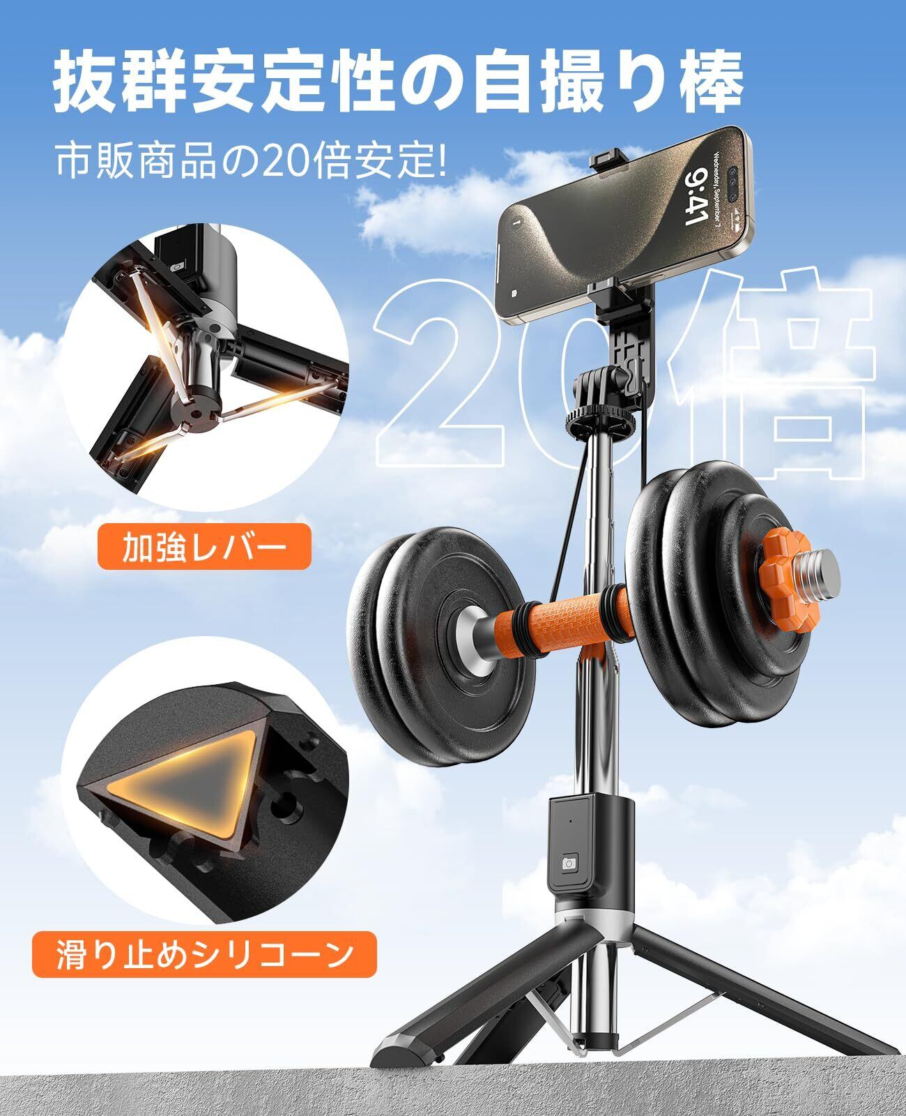 【ミニ三脚一体型&抜群の安定性】 手持ちと据え置きの両方に対応したカメラ用卓上三脚一体型の設計。まさに次世代の自撮り棒。脚部には滑り止めゴムを採用し、傘型にしっかり広がる構造で屋外の不安定な地面や風のある環境でもプロのような安定した画質で撮影できるのが自慢です。9段階伸縮のアルミ合金製ロッドは耐久性も高く、長期間の使用でも安心。セルフィーや風景写真、動画撮影など様々な用途に安定した撮影が可能です。