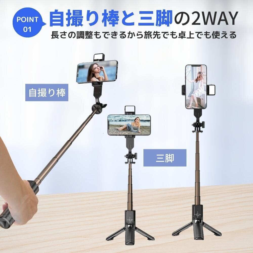 【自撮り棒と三脚の2way】当商品は自撮り棒としてお使いいただけるだけではく、三脚としても使用出来る優れ物です。長さも調節できるので、旅先でも卓上でも、お好きなシーンでお使いいただけます。また最長70㎝も伸びるので、自撮りをする際は全身や背景までバッチリ映せる商品となっております。三脚としてご使用いただいた場合、脚に滑り止めが付いているため安定感は抜群です。しっかり支えられているため、外でも直ぐに楽々と撮影していただけます。