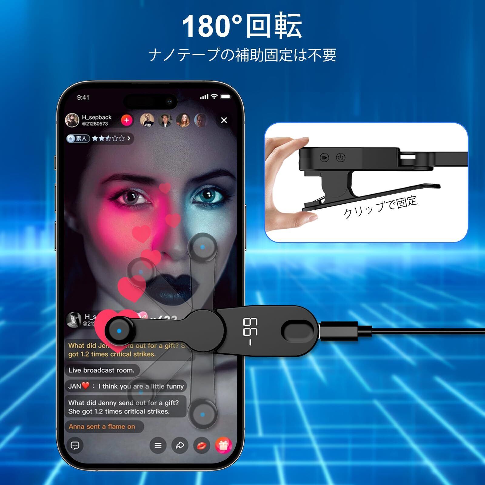 これは、高速/低速クリック操作を指に代わって行う自動クリッカーです。198段階のクリック速度から選択可能。クリップで固定する方式で、挟むだけで即使用可能。スマートフォンとのBluetooth接続が不要なため、非常に手軽に使え、コンパクトで携帯性にも優れています。クリック速度が極めて安定しているため、TikTokのライブ配信での「いいね」連打や、チケットや限定商品の争奪戦に使うユーザーもいるようです。