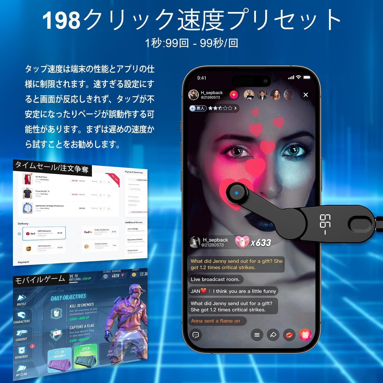 【198のクリック周波数レンジ】2025年の革命的な改良では、198のクリック周波数レンジを持っています。この周波数レンジは市販の同類品より2~3倍にアップし、99秒に1回~1秒に99回のクリック頻度をカバーしています。【ご注意ください】タップ速度は端末の性能とアプリの仕様に制限されます。速すぎる設定にすると画面が反応しきれず、タップが不安定になったりページが誤動作する可能性があります。まずは遅めの速度から試すことをお勧めします。