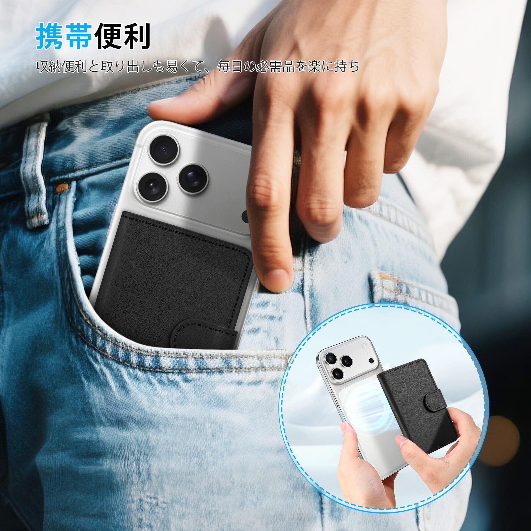 【マグネット型・強力磁力でしっかりと吸着】マグネット型の吸着カードケースで、強力な内蔵マグネットにより、iPhone 16/15/14/13/12シリーズをしっかりと保持します。軽量設計により、スマートフォンの背面にシームレスに接続でき、ポケットから取り出す際にも安定性を保ち、落下の心配がありません。マグネットの特性により、本体やカードポケットに残留する接着剤のリスクも無く、安心してご使用いただけます。また、この吸着カードケースは、の本革磁力ケースおよび2 in 1分離可手帳型の背面カバーにも対応しており、多様な使用シーンでの利便性を提供します。