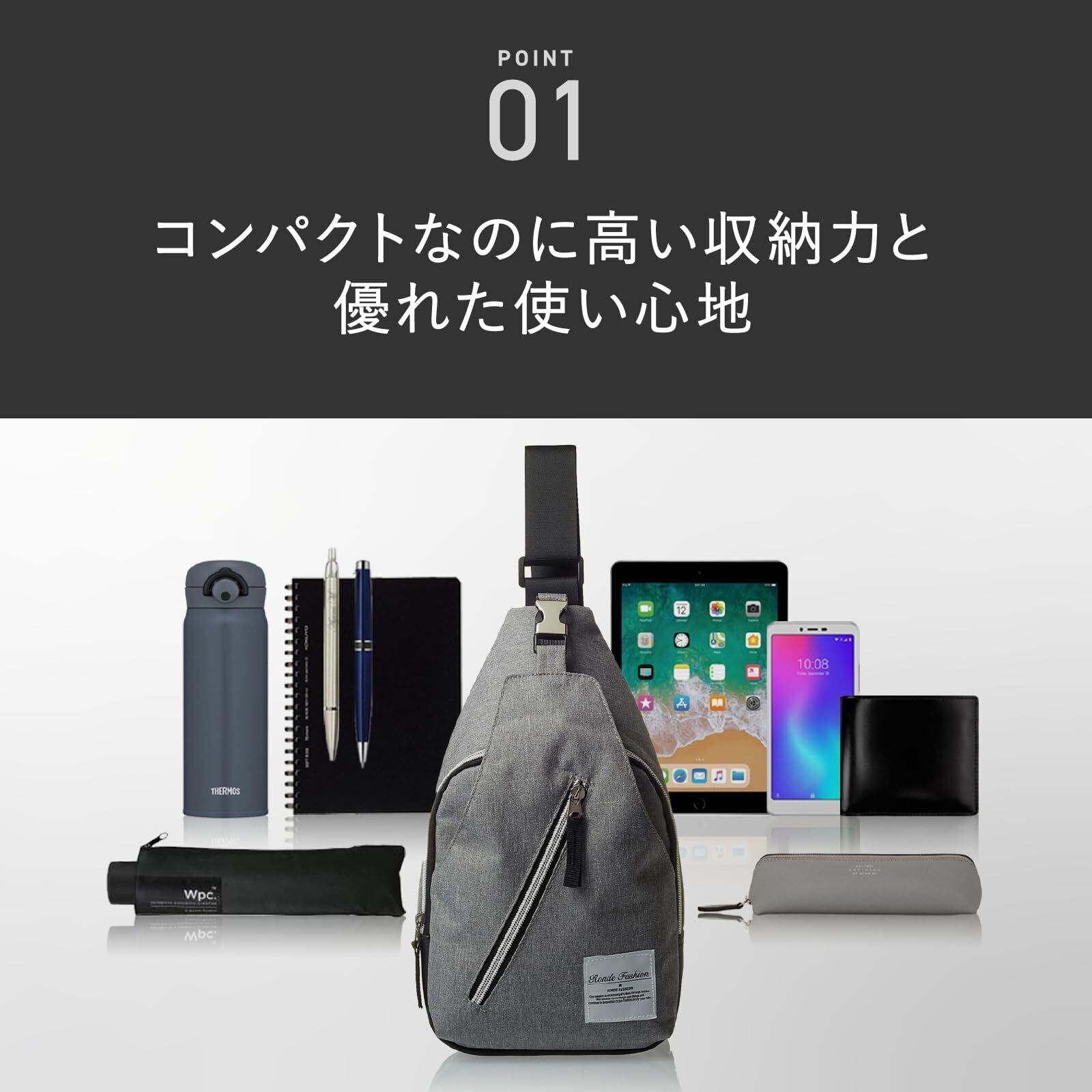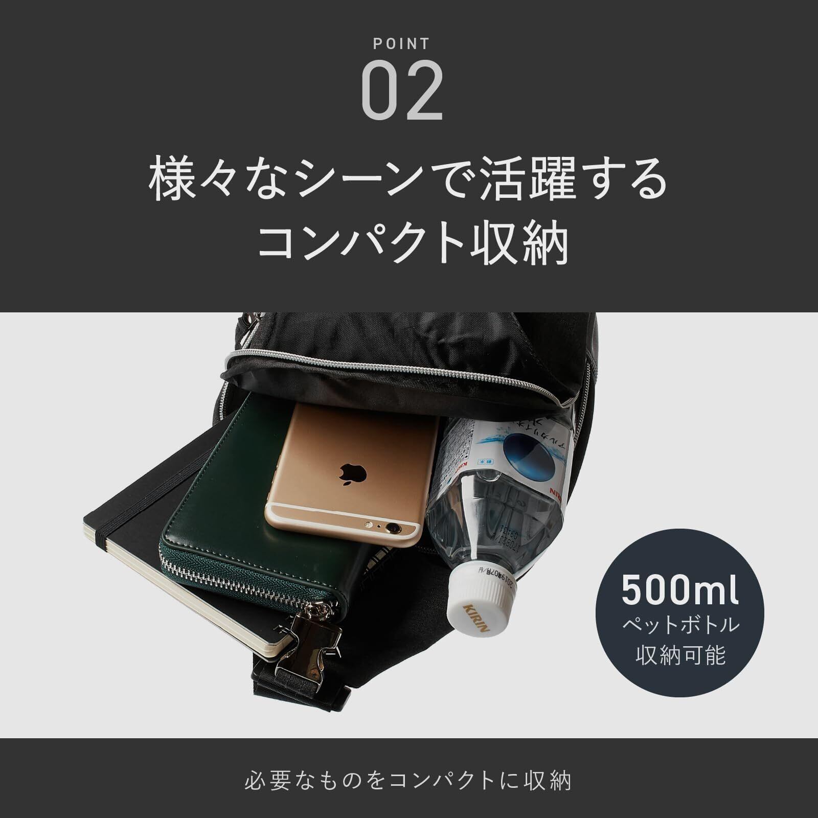 【コンパクトなのに優れた収納力】 横18cm×縦36cm×厚さ6.5cmのコンパクトな見た目でありながら、500mlペットボトルや折りたたみ傘、長財布、タブレットなど必要なものがしっかり収納できます。 すぐに取り出したいスマホや鍵、イヤホンなどの貴重品の収納に便利な前面ファスナーポケットも配置。メインルーム内部にも小物を見失わないようポケットがあり、整理して収納できます。