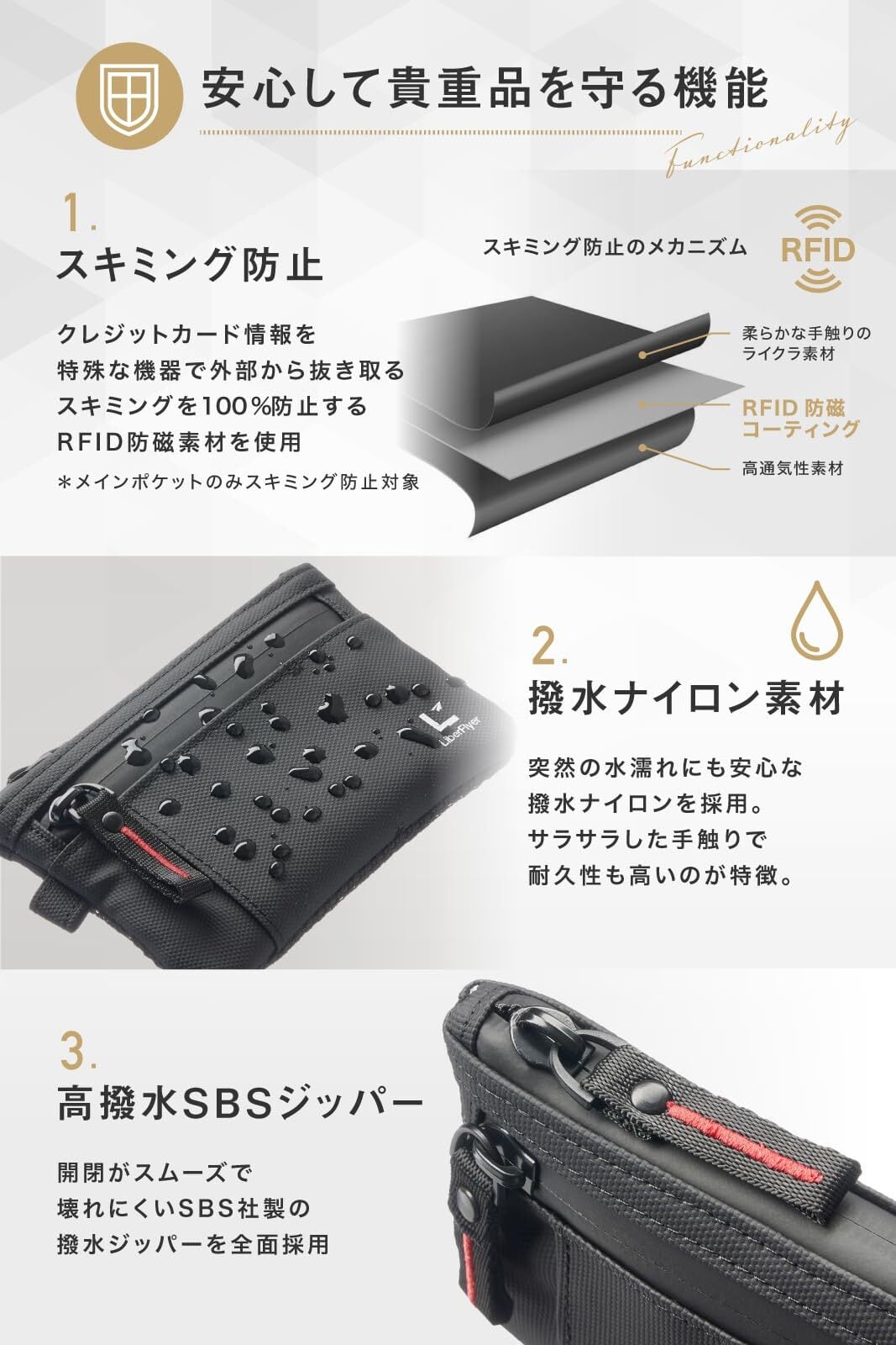 【他にはないセキュリティ性】: 海外旅行中のスリやスキミング対策に、メインポケットにスキミング防止機能を搭載。付属のブラックキーチェーンでパンツのフックに固定でき、引っ張られても簡単に盗られない安心設計。 【突然の水濡れも安心】: 撥水加工ナイロンとSBS防水ジッパーで、急な雨や水濡れから中身をしっかりガード。耐久性も高く、開閉もスムーズに。