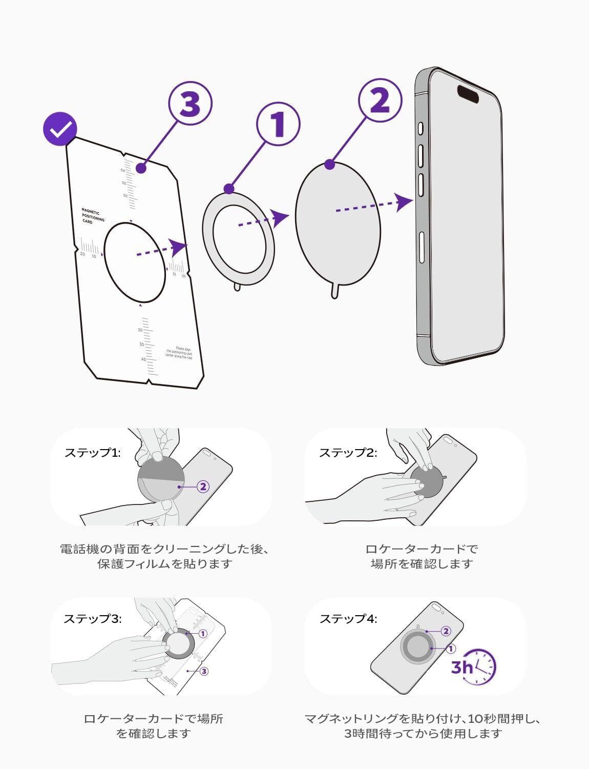【強力両面シール・取付簡単】より強力な接着のために高品質の粘着テープを使用!強い 粘着力でスマホにしっかり貼り付けられるので、磁力が強くてもmagsafe シールがマグセーフ リングやmagsafe車載器などのMagSafe機器についてしまう心配はありません。iphone magsafe リング シールをiPhoneやケースの背面に貼るだけで、マグネットの吸着力が向上します。付属の貼り付けガイドをご利用いただくと、正しい位置にシールを貼ることができます。c