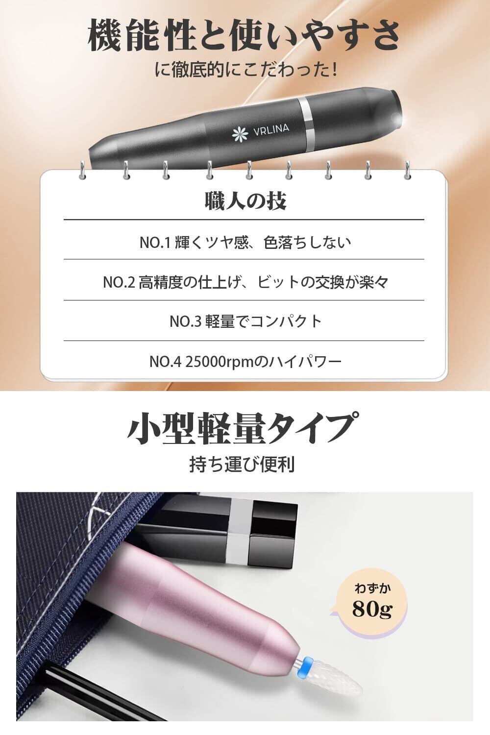 【新開発・人気ネイルリストが監修】より使いやすいネイルマシンを目指してプロのネイルリストの監修のもとで開発された電動ネイルマシン。総合ランキングナンバー1!海外でも大絶賛好評中!!ネイルオフの基本操作から自爪や甘皮処理などの指先のケアまで、この一本があれば十分!ビットの交換が楽々取扱説明書と見ればすぐに始められるため、初心者の方でも簡単にお使い頂けます。