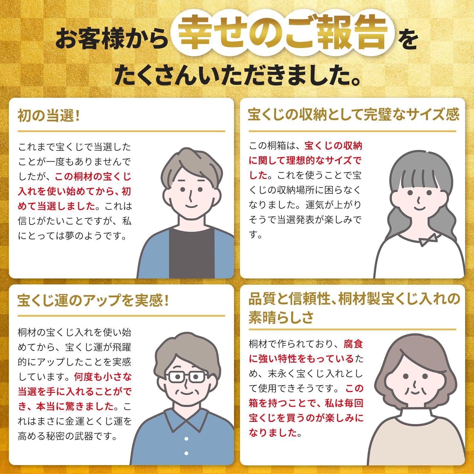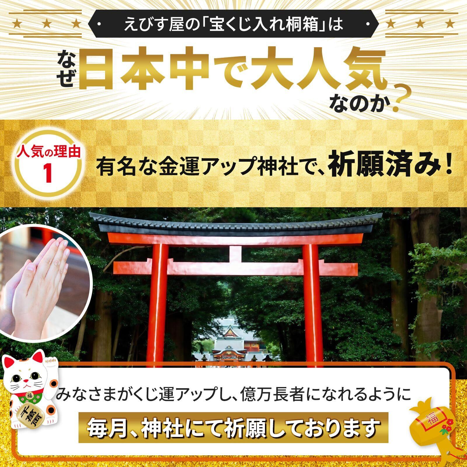こちらの商品は神社にて祈願しております。 商品は宝くじ入れ1箱とゴールドレプリカ紙幣が1枚です。 ●桐箱 職人手作り (日本産) ●写真はイメージです。「宝くじ」は、商品ではありません。 ●桐箱サイズ 内寸(横80mm、奥行165mm、高さ15mm) ●外寸(横100mm、奥行185mm、高さ25mm) ●10億円ゴールド サイズ 1万円札と同じ ●宝くじと10億円ゴールドを入れてご使用ください! 宝くじがぴったり入るケースです。 (宝くじが100枚入ります)