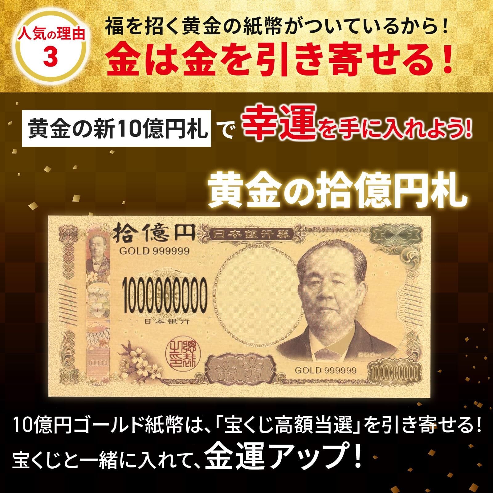 商品は宝くじ入れ1箱とゴールドレプリカ紙幣が1枚です。祈願済み商品です。