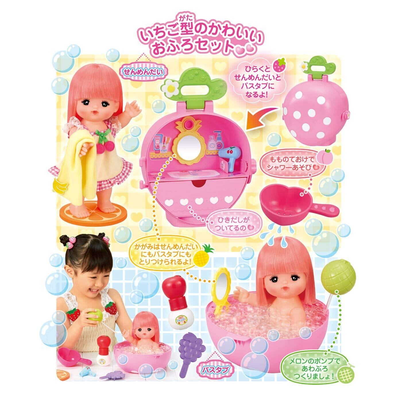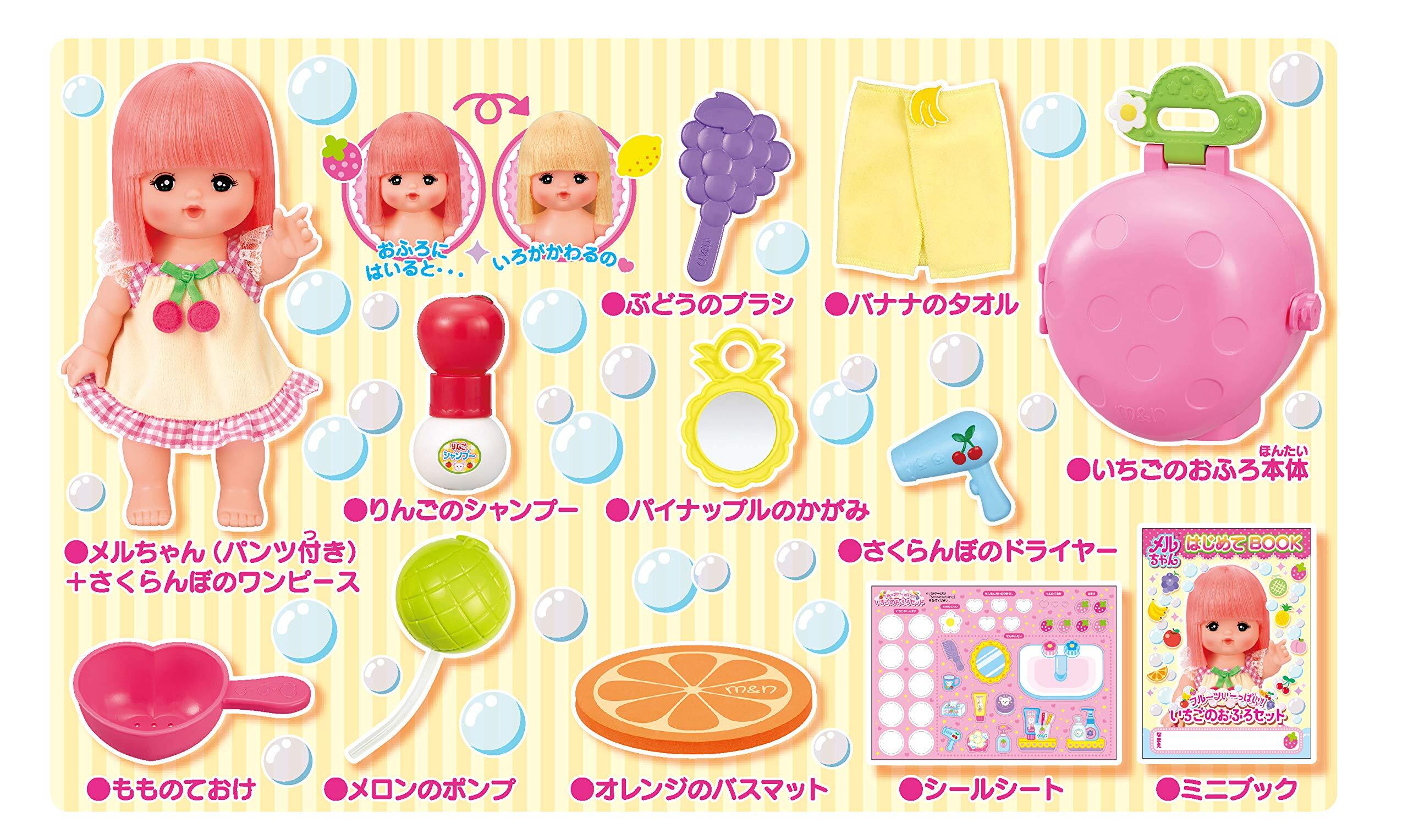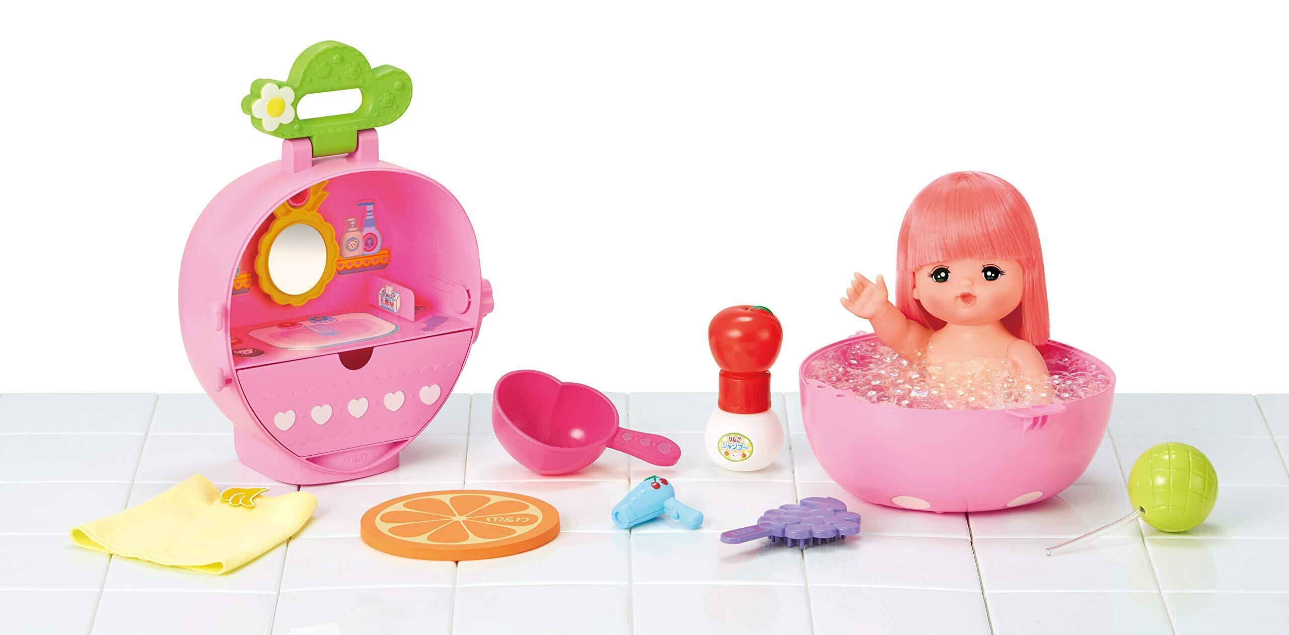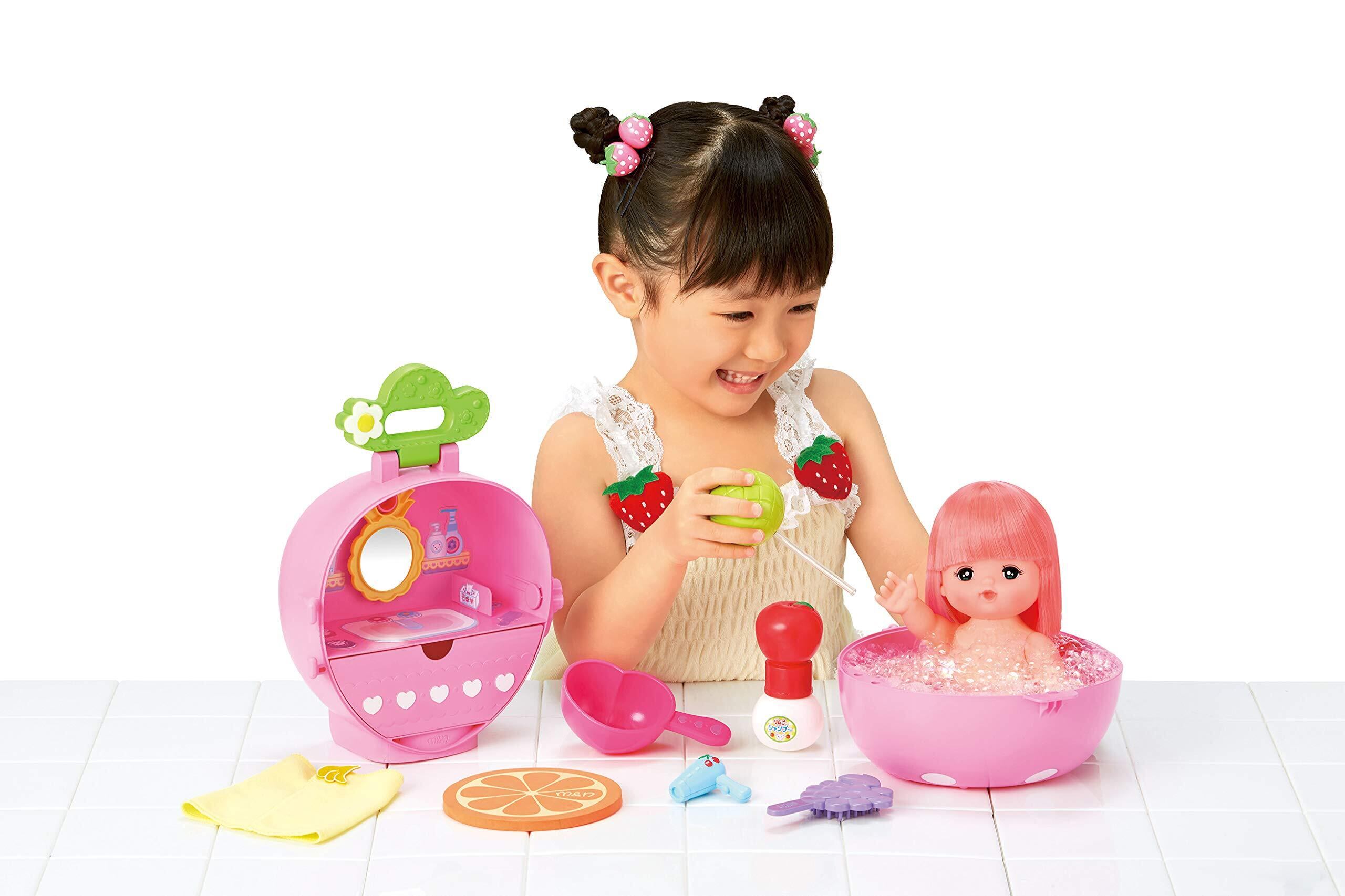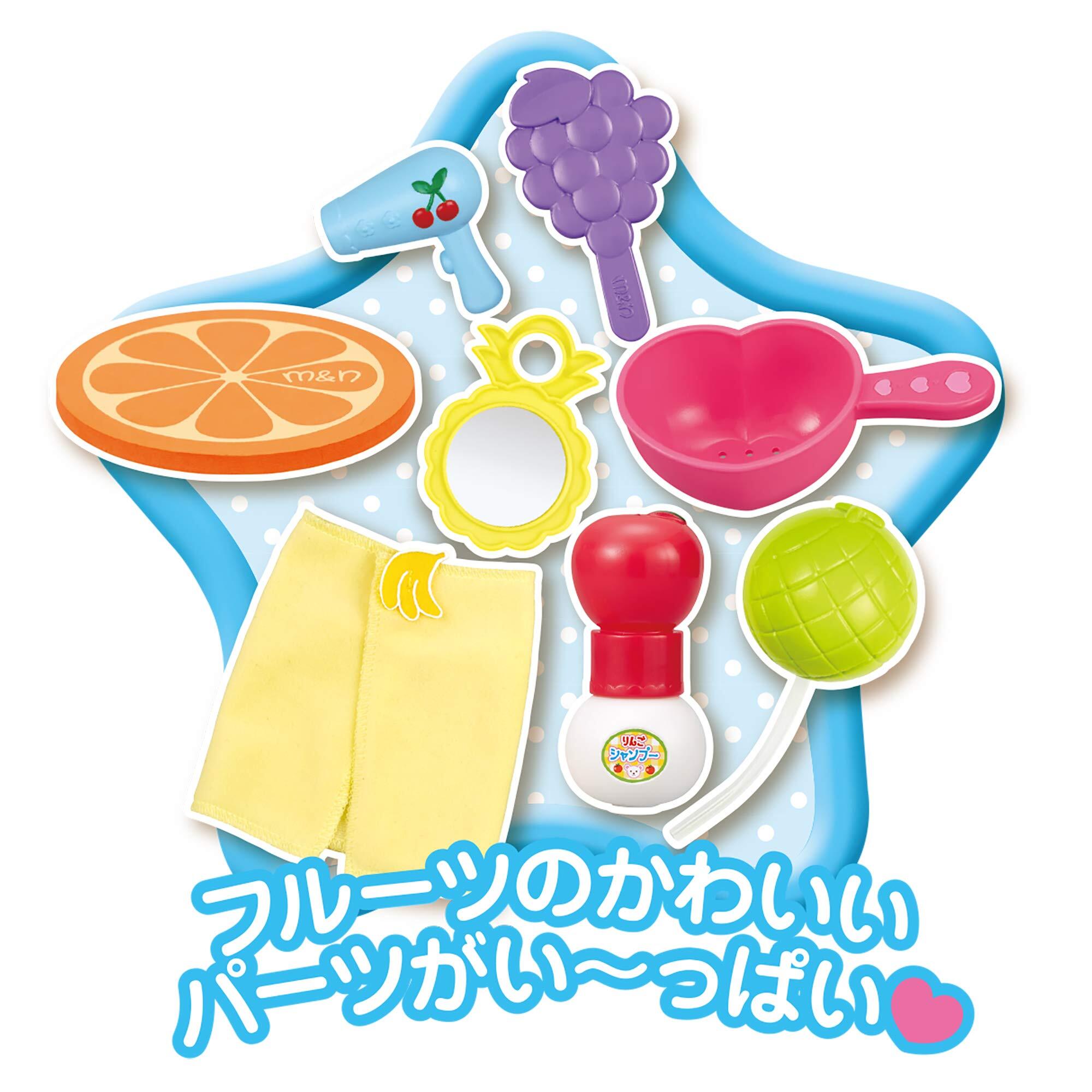 メルちゃんとおふろで楽しく遊べる、お人形とかわいいフルーツパーツがたくさん入ったセット。