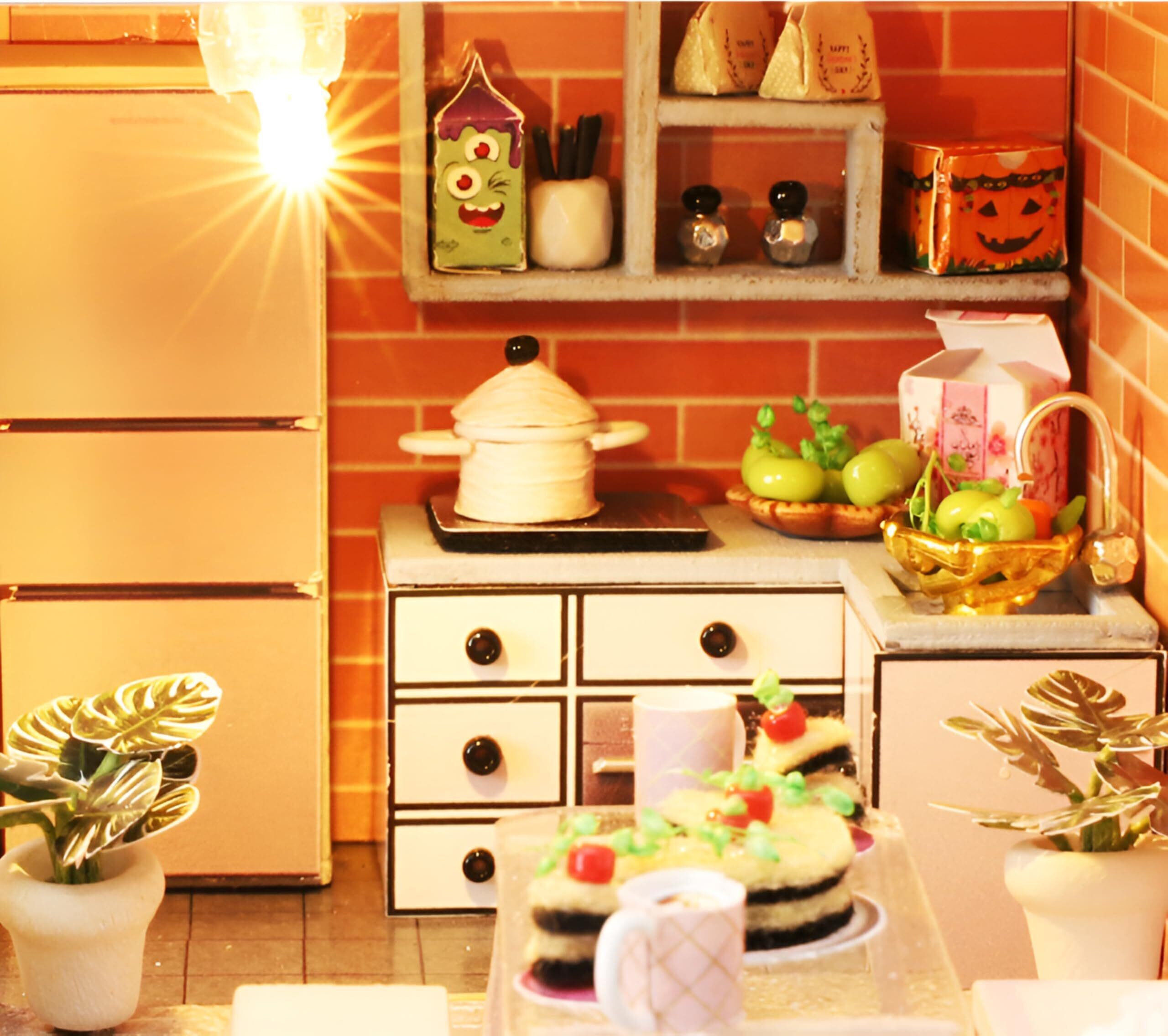 LEDライト&オルゴール付きで雰囲気抜群:温かい光を放つLEDライトと心地よいオルゴール音で、ミニチュアハウスがさらに魅力的に。夜のインテリアや贈り物に最適です。