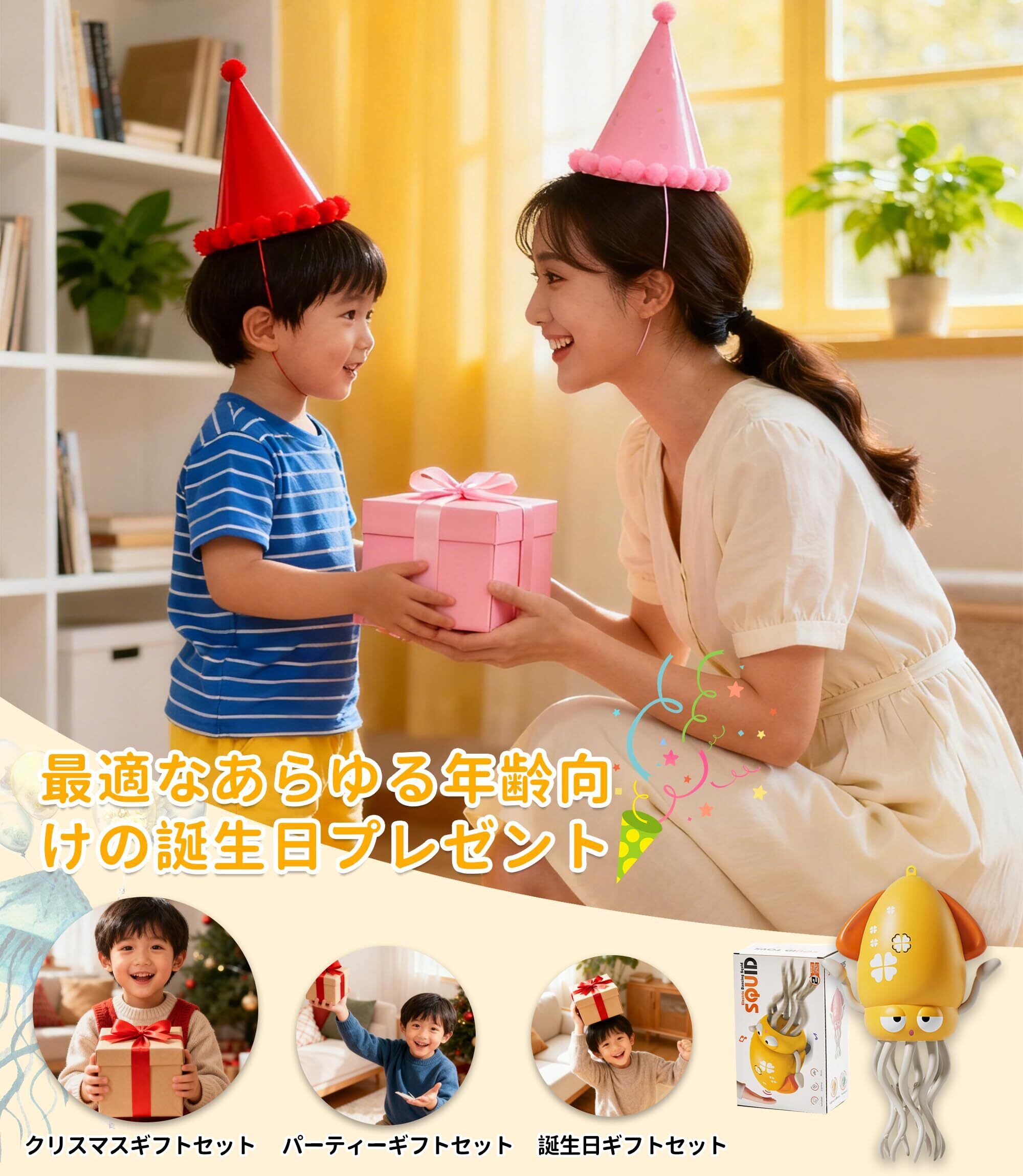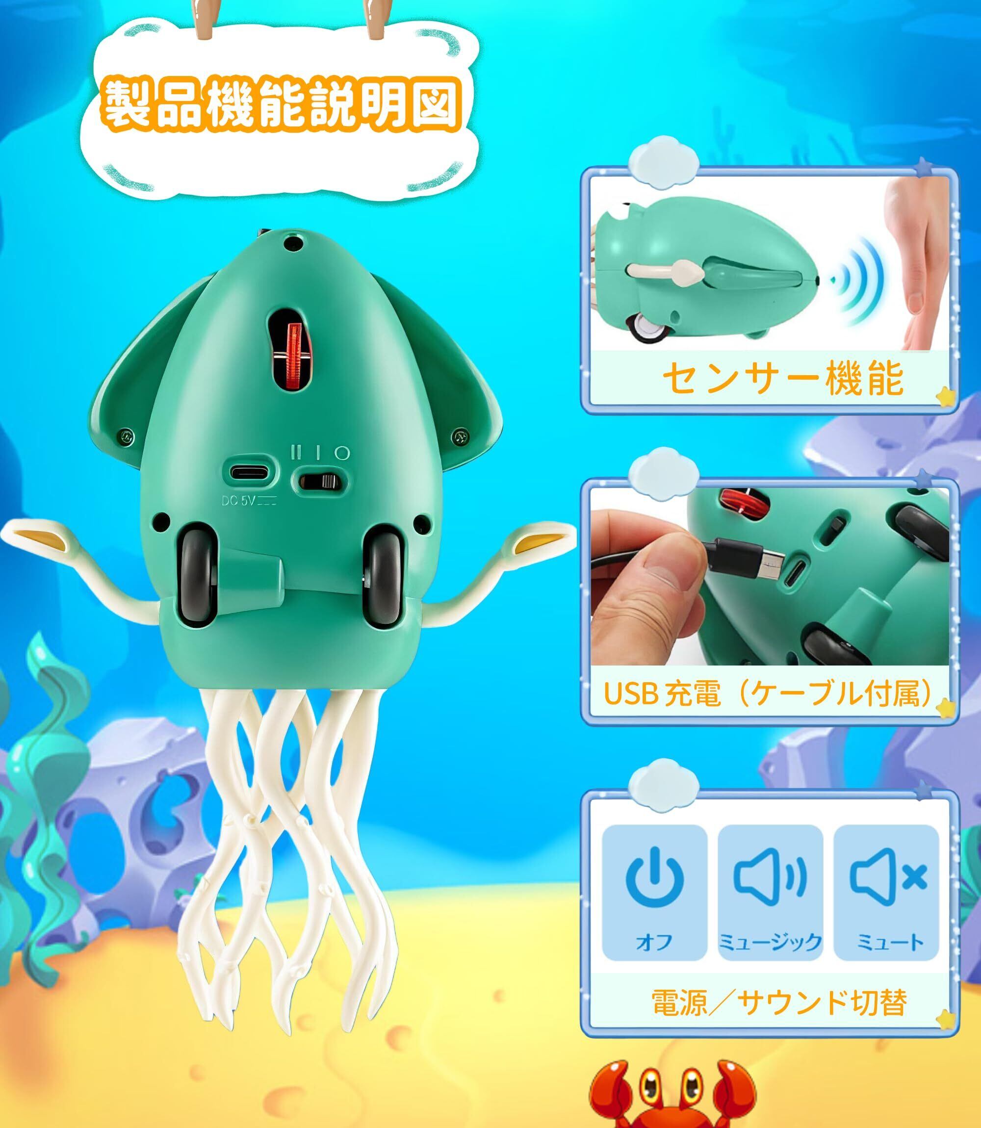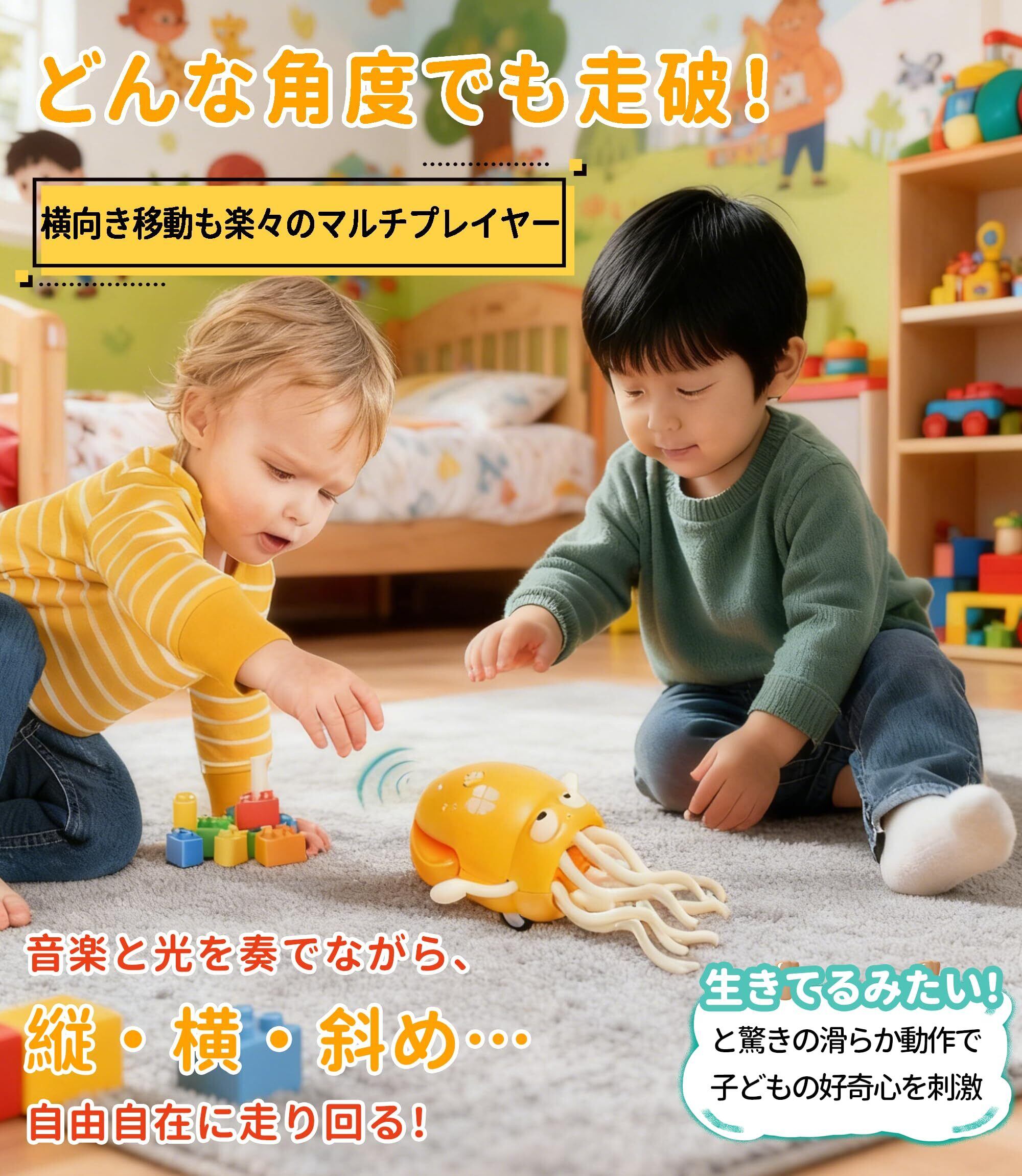 【音楽とダンスで楽しく遊べる!】カラフルなLEDライトとリズミカルな音楽に合わせて、イカがユニークなダンスを披露! 8本の足が360°回転し、子供の好奇心を刺激。赤ちゃんのハイハイ練習や幼児のリズム感育成に最適です。【スマート障害物回避センサー搭載】内蔵センサーが家具や壁を自動検知し、スムーズに方向転換。ぶつかりにくい設計で、安心して遊ばせられます。這ったり立ったりする多様な動きで、子供もペットも夢中に!【知育機能で成長サポート】音楽・光・動きの組み合わせが、聴覚・視覚・運動能力を刺激。磁気付きの釣り竿(※一部モデル)で遊べば、手指の協調性や集中力もアップ! 0~6歳の知育玩具としておすすめ。