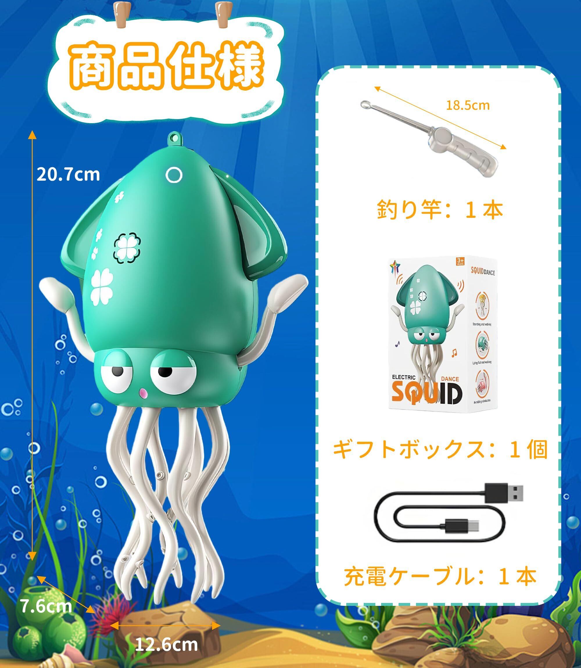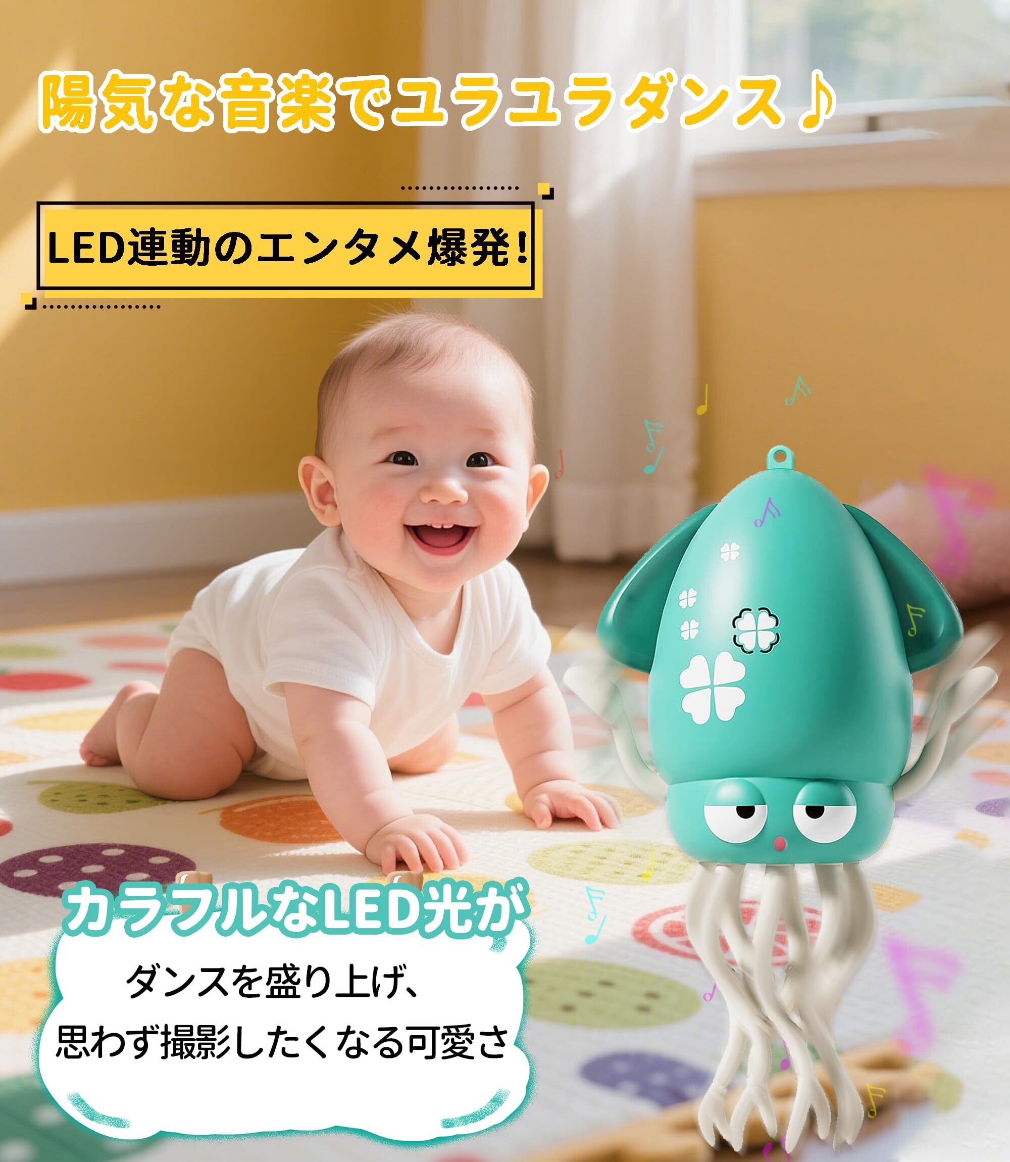 【音楽とダンスで楽しく遊べる!】カラフルなLEDライトとリズミカルな音楽に合わせて、イカがユニークなダンスを披露! 8本の足が360°回転し、子供の好奇心を刺激。赤ちゃんのハイハイ練習や幼児のリズム感育成に最適です。