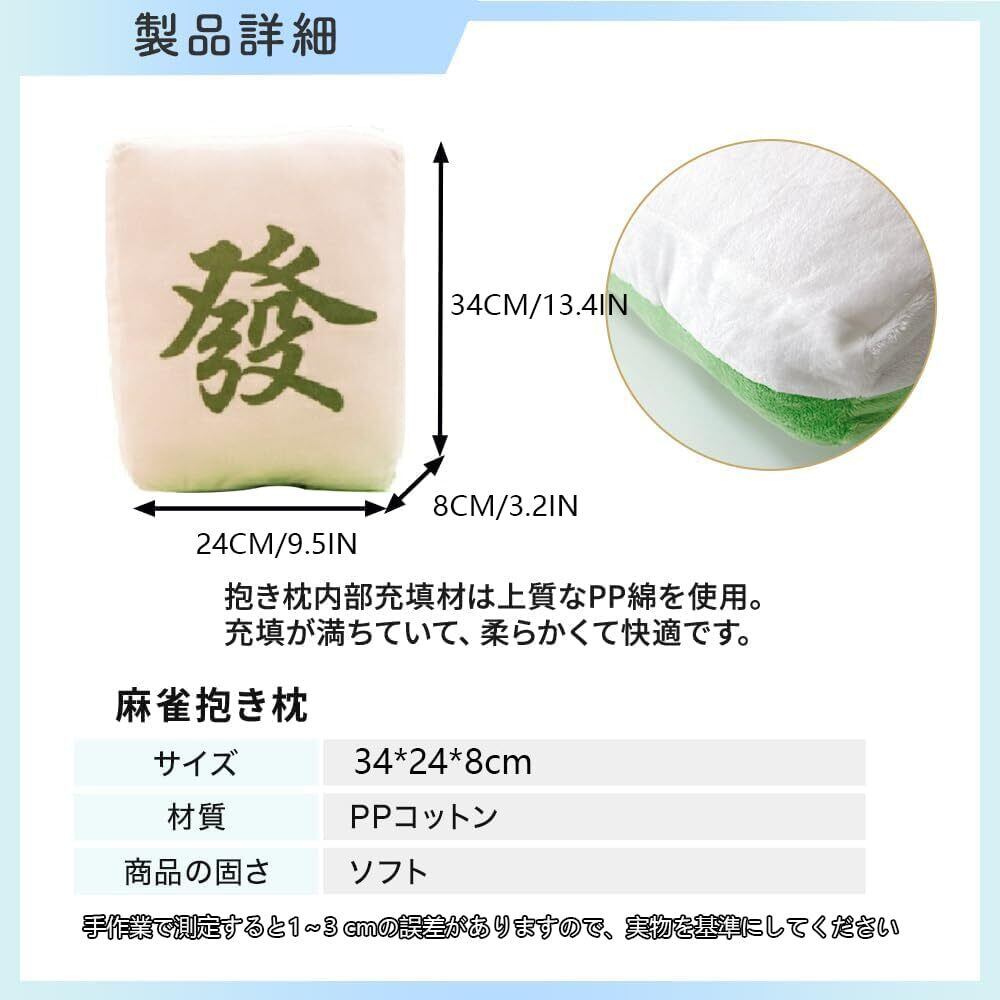 ふわふわで癒される!麻雀牌クッションです。 誕生日プレゼント、クリスマスギフト、バレンタイン、ホワイトデーなど、特別な日の麻雀好きのお友達への贈り物にぴったりです。 手洗い可能なので、汚れても簡単にお手入れできます。いつでも清潔&ふわふわの状態をキープ! かわいいぬいぐるみクッションを探している方 抱き枕やクッションとしても使いたい方 インテリアにもなるおしゃれなデザインが欲しい方 プレゼントに喜ばれるアイテムをお探しの方