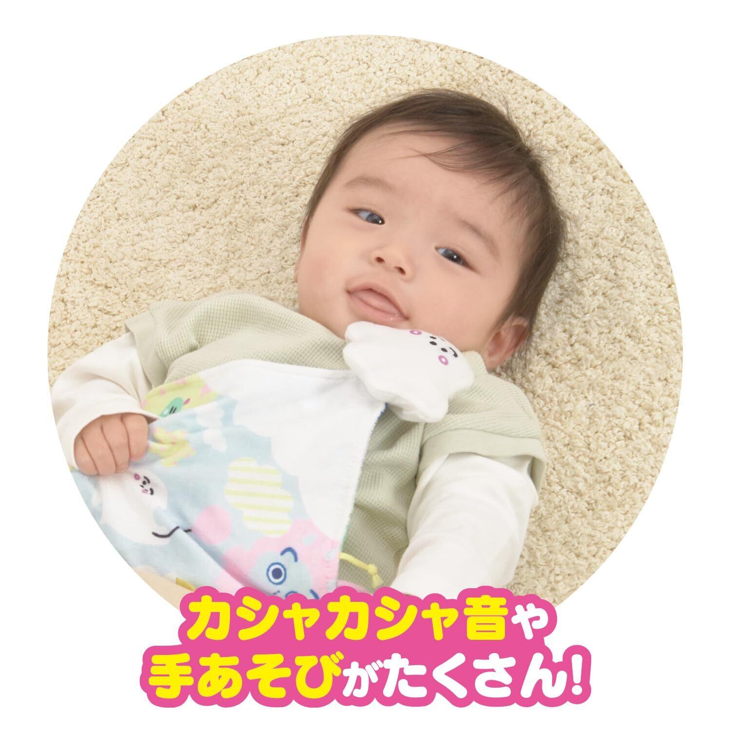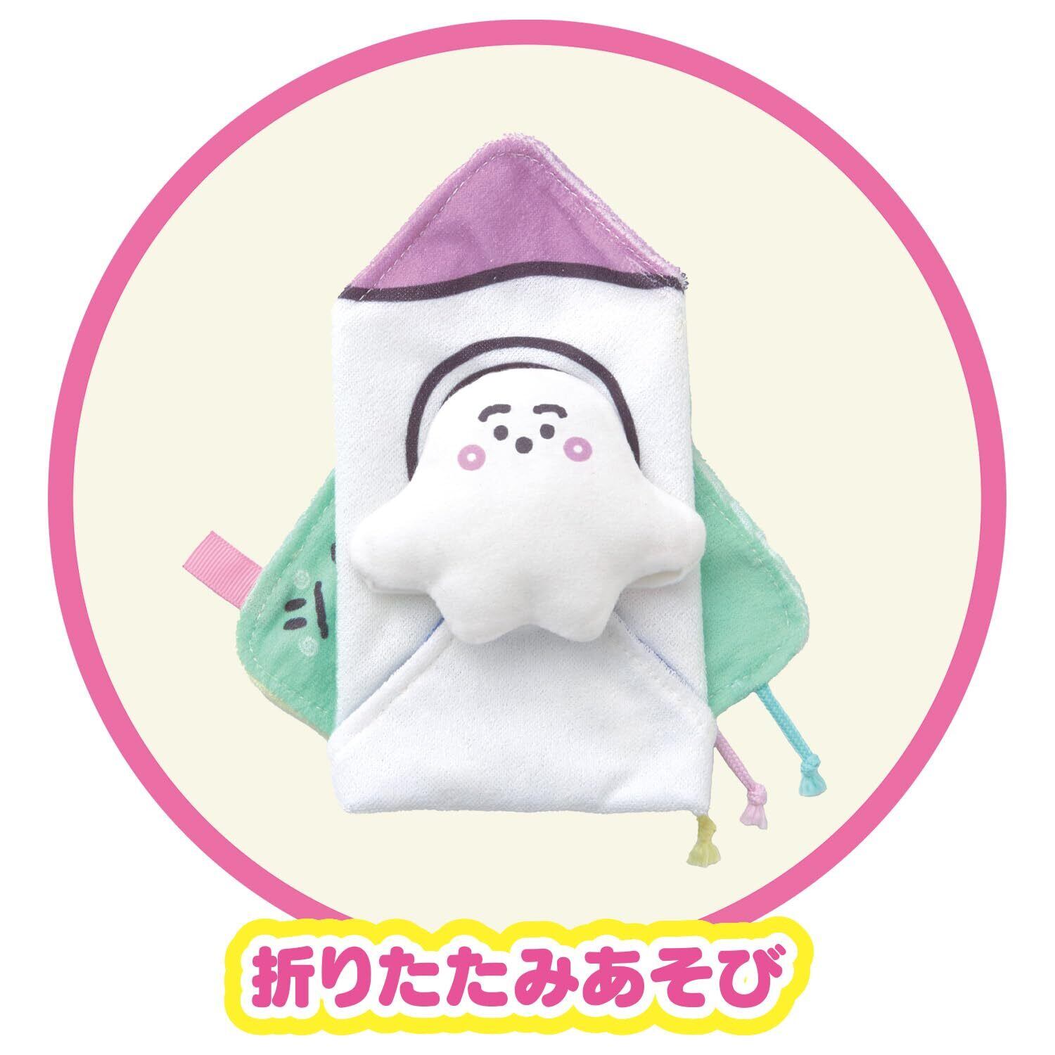 パペットとしてコミュニケーションをとったり、 “にゅうのおふとん”や“ロケット”の形など折りたたみあそびもできるため、月齢に合わせて長くあそべる仕様です。