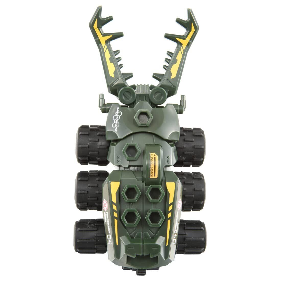 機体のチャージホイールでビクトリーチャージ!乾電池不要のフリクション動力で角や大顎を動かしながらパワフルにバトルをするぞ!