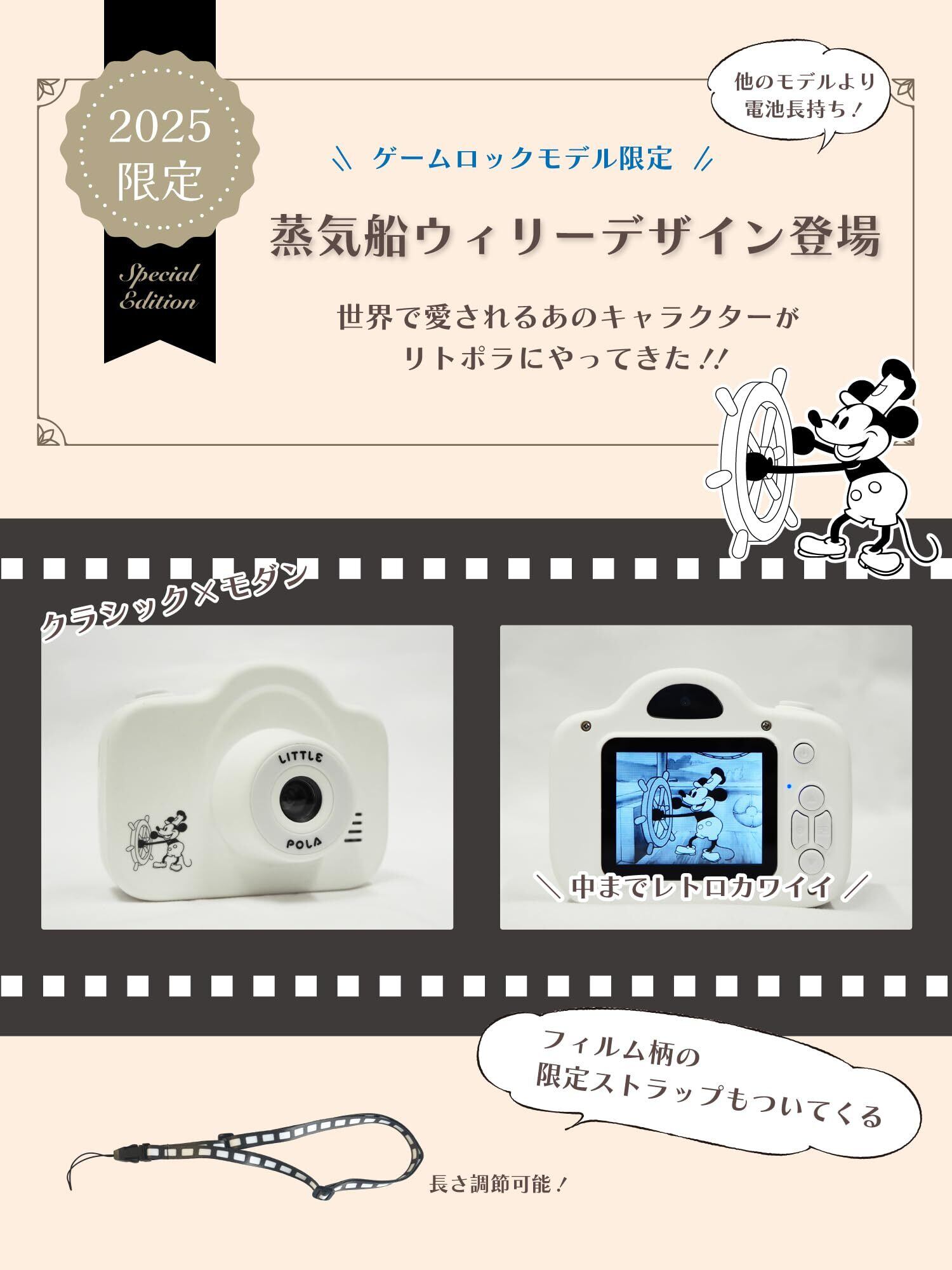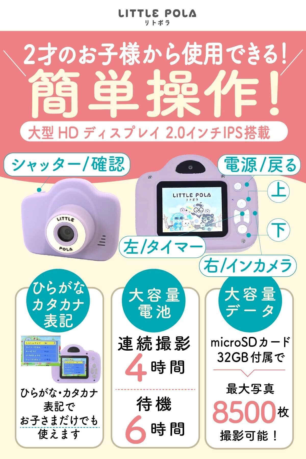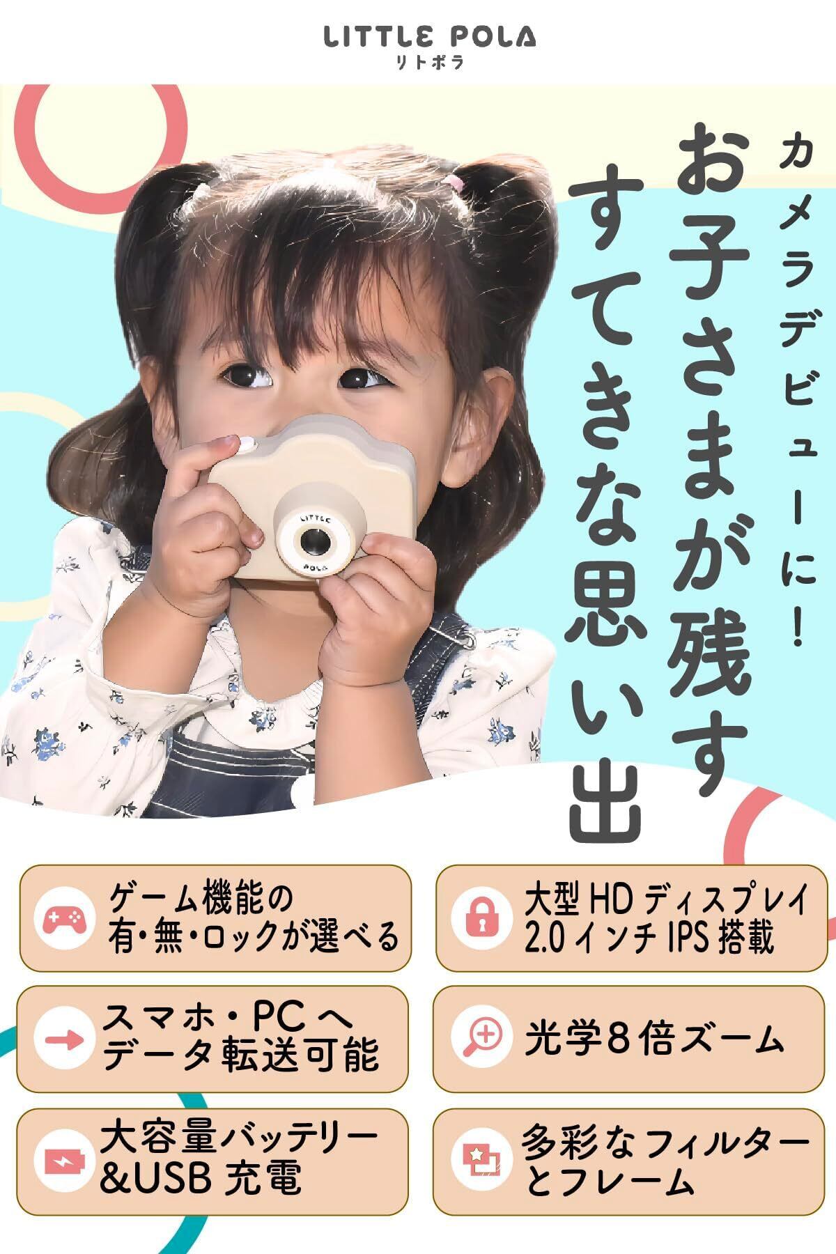【リトポラ キッズカメラ】小さくて軽く壊れにくい設計のため2歳からのお子さまにご使用いただけるトイカメラです。 ひらがな・カタカナ表記なので、かんたんに操作可能で写真を撮ることはもちろん、動画の撮影をしたり、知育ゲームで勉強することも出来ます。※ゲームあり、なし、ロック機能付は購入前に選択可能です。