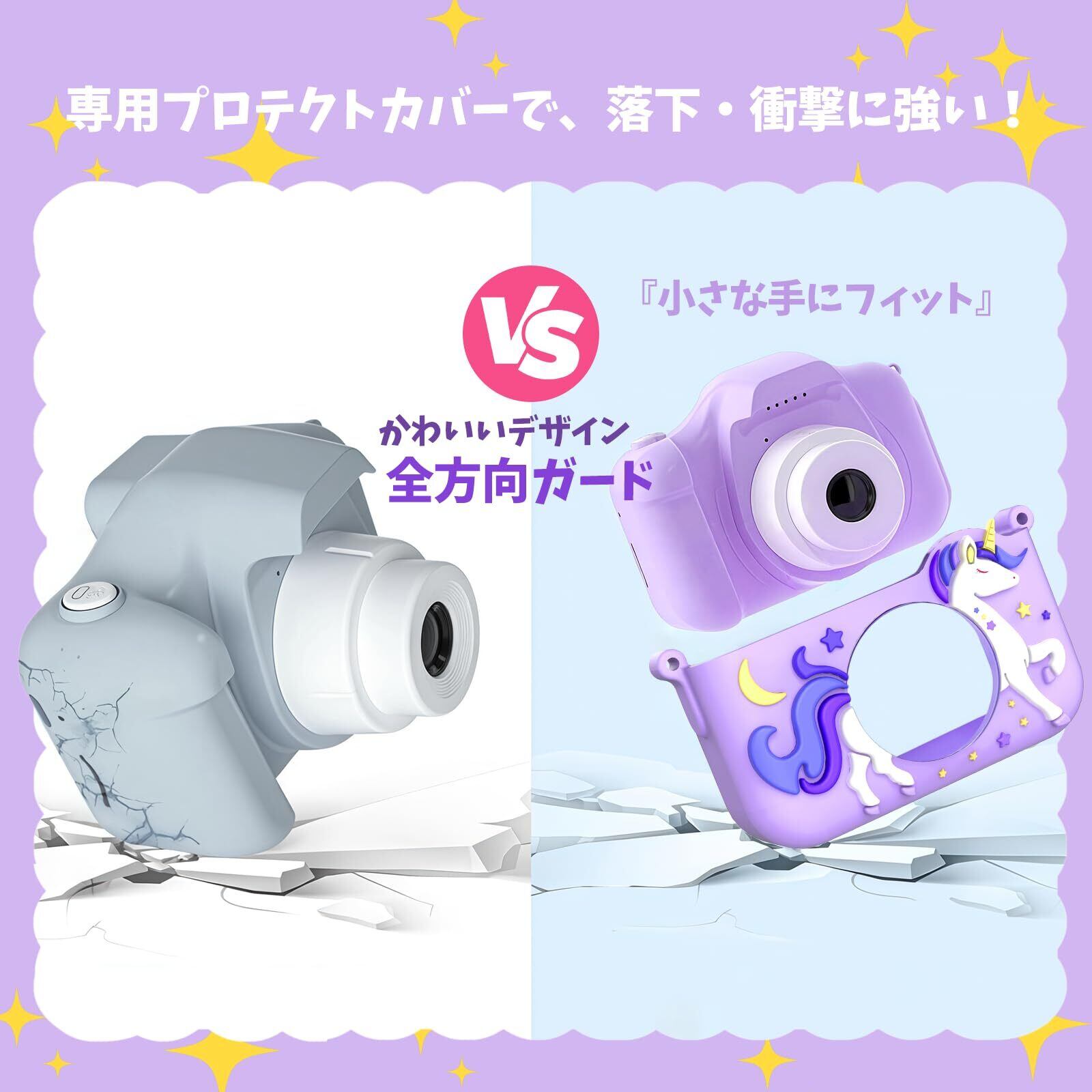 【子ども視点で作られた安心設計】お子様の使用を第一に考えました。画面の明るさ調整機能に加え、2.0インチのIPS画面を採用し、視覚的に快適です。操作パネルと説明書はひらがな表記なので、小さなお子様でも無理なく使い始められます。付属の可愛いユニコーンのシリコン保護ケースが衝撃からカメラを守り、安心して遊ばせられます。