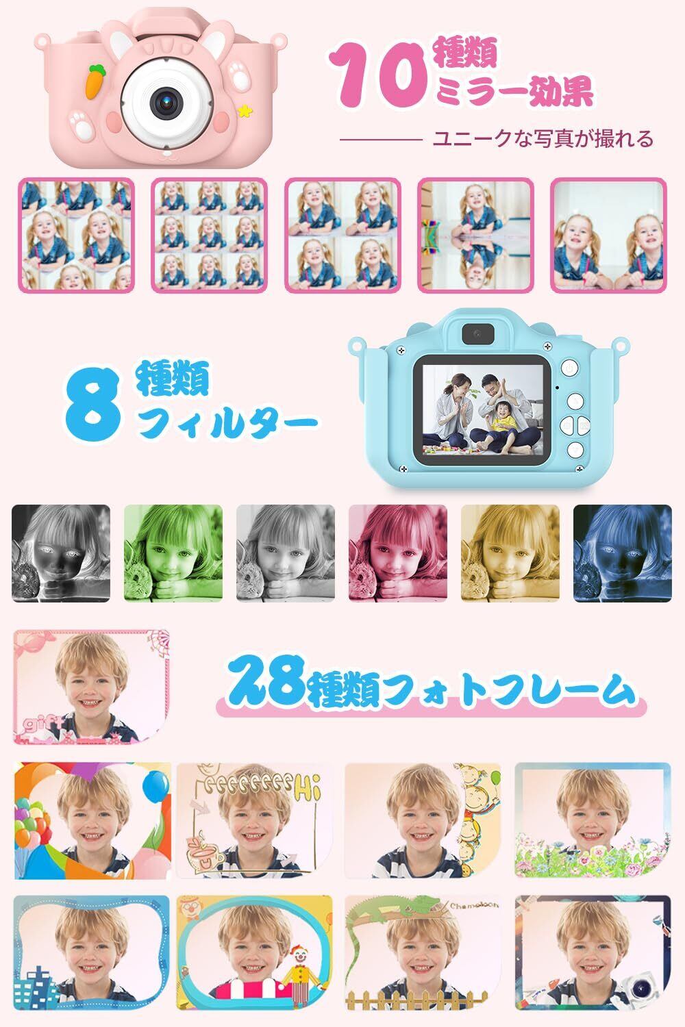 【多機能トイカメラ&5種類ゲーム&音楽再生】28種類の可愛いフォトフレーム、10種類のミラー効果、8種類のカラーフィルターで様々な写真を撮影することができます。最大8倍のズームと5秒のタイマー撮影も可能なので、1台で色々な遊び方ができます。お子様の芸術的センスを伸ばす一助にもなるかもしれません。カメラ機能だけでなく、知育にも適したゲームが5種類インストール済みなので、おうちでも子供カメラを楽しむことができます。音楽機能付き、メモリーカードにお手元のデータを入れれば音楽モードで再生できます。子どもたちがスマホがなくても、自分の好きな音楽を楽しむことができます。