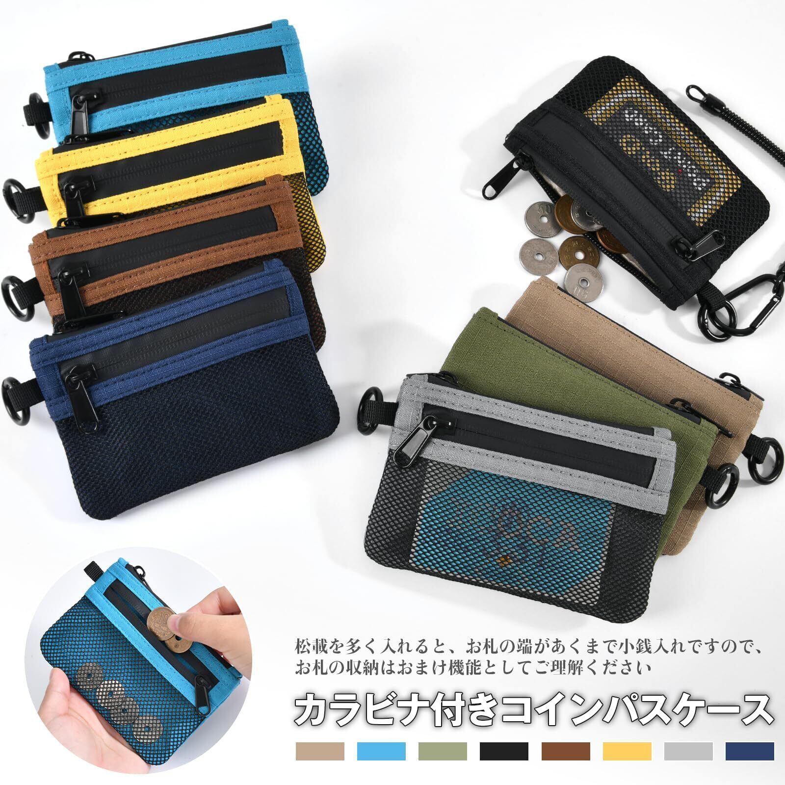 【パスケース 小銭入れのサイズ】小銭入れ本体サイズ縦 (約)12.5cm×横(約)8.5cm、重さ約45g。コイルストラップ付き*1(取り外し可能)、カラビナ付き*1(取り外し可能)、リングバックル付き*1(取り外し可能)。ナイロンキャンバス製で、ジッパーは防水仕様。
