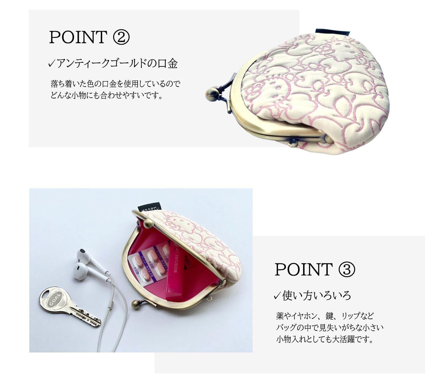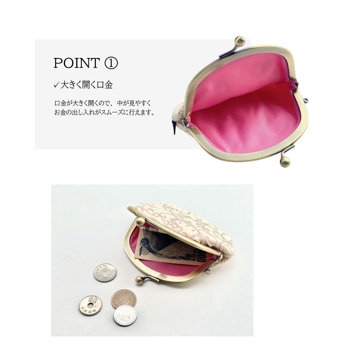 小銭入れとしてお使いいただけるのはもちろんのこと、バッグの中で迷子になりそうなお薬、絆創膏やリップ、USB、イヤホン、ソーイングセットなど小物入れとしてもお使いいただけます。 小銭は10円玉が100枚入ります。お札も三つ折りならOKです。