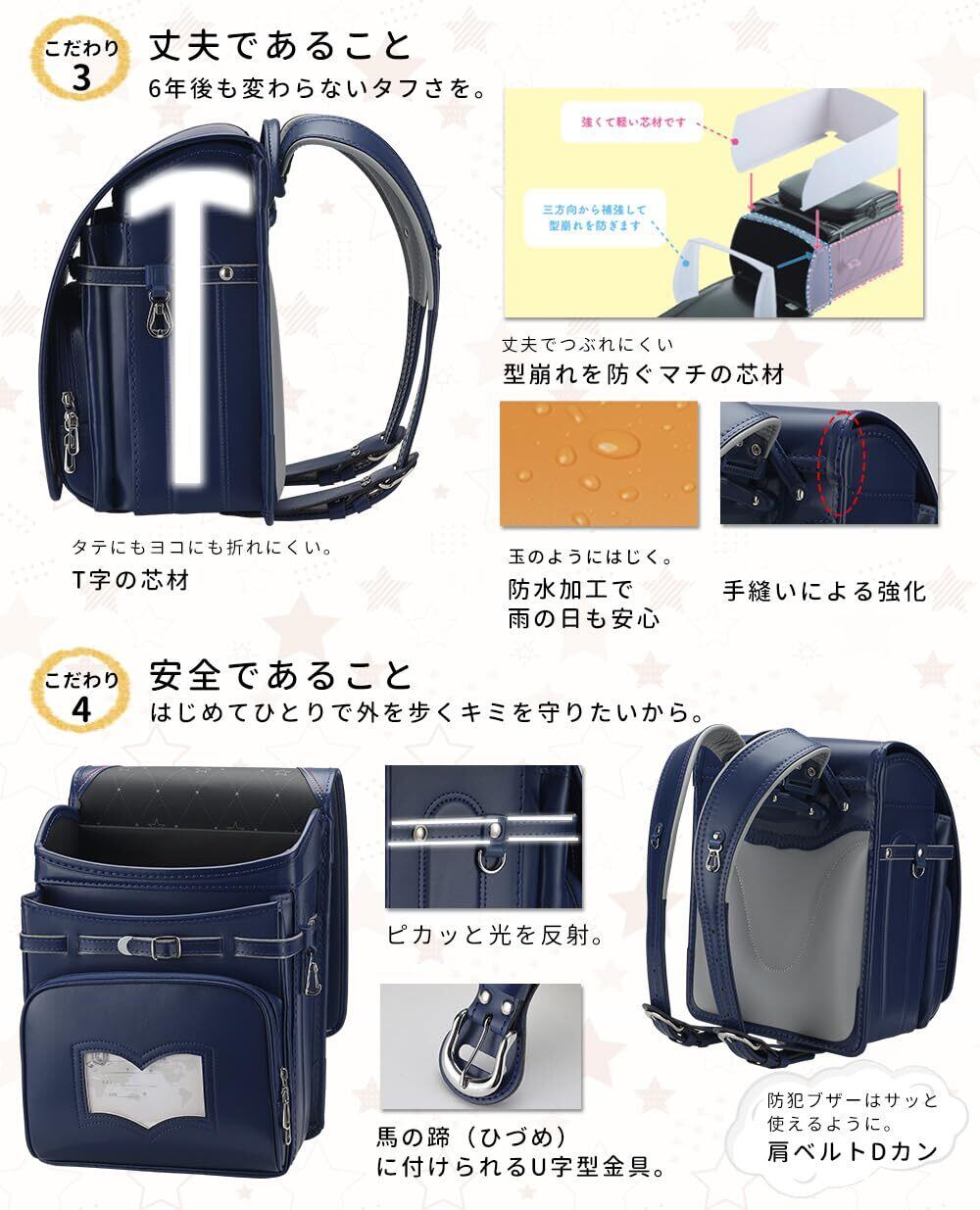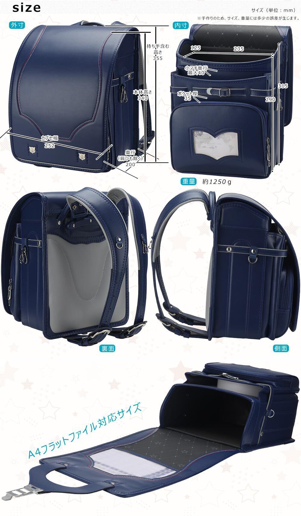【適用年龄 1年生-6年生】縦幅も横幅も広くて、教科書やノート、A4フラットファイルなどがすっぽり入ります!本体サイズ:高33×巾25×マチ17cm (主収納室) 重量:約1200g 素材:本体=人工皮革(R)F ニューモ(R)ST 背当・肩ベルト裏=人工皮革(R) 内装=合成皮革 カブセ裏=合成皮革 ワンタッチロック