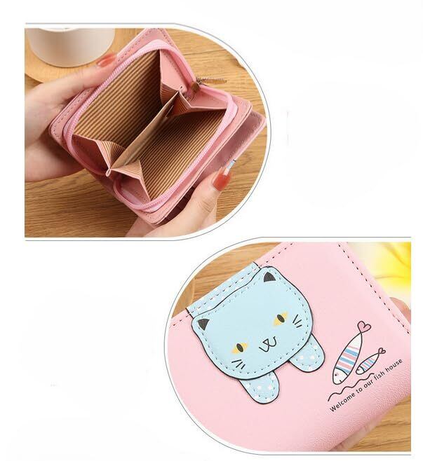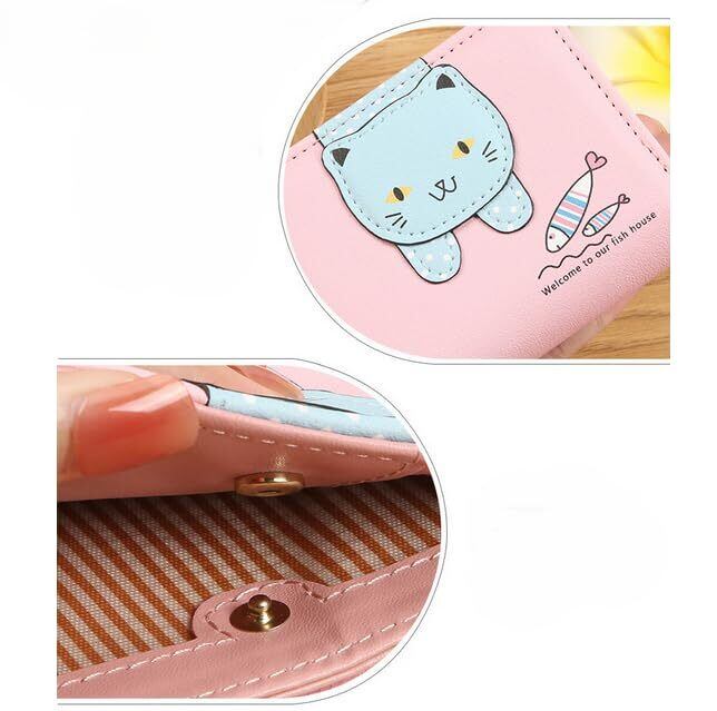 [Kingfisher] 財布 女の子 二つ折り キッズ財布 PUレザー製 「キュートな猫デザインが特徴」 (フィッシュキャット-ブル-)