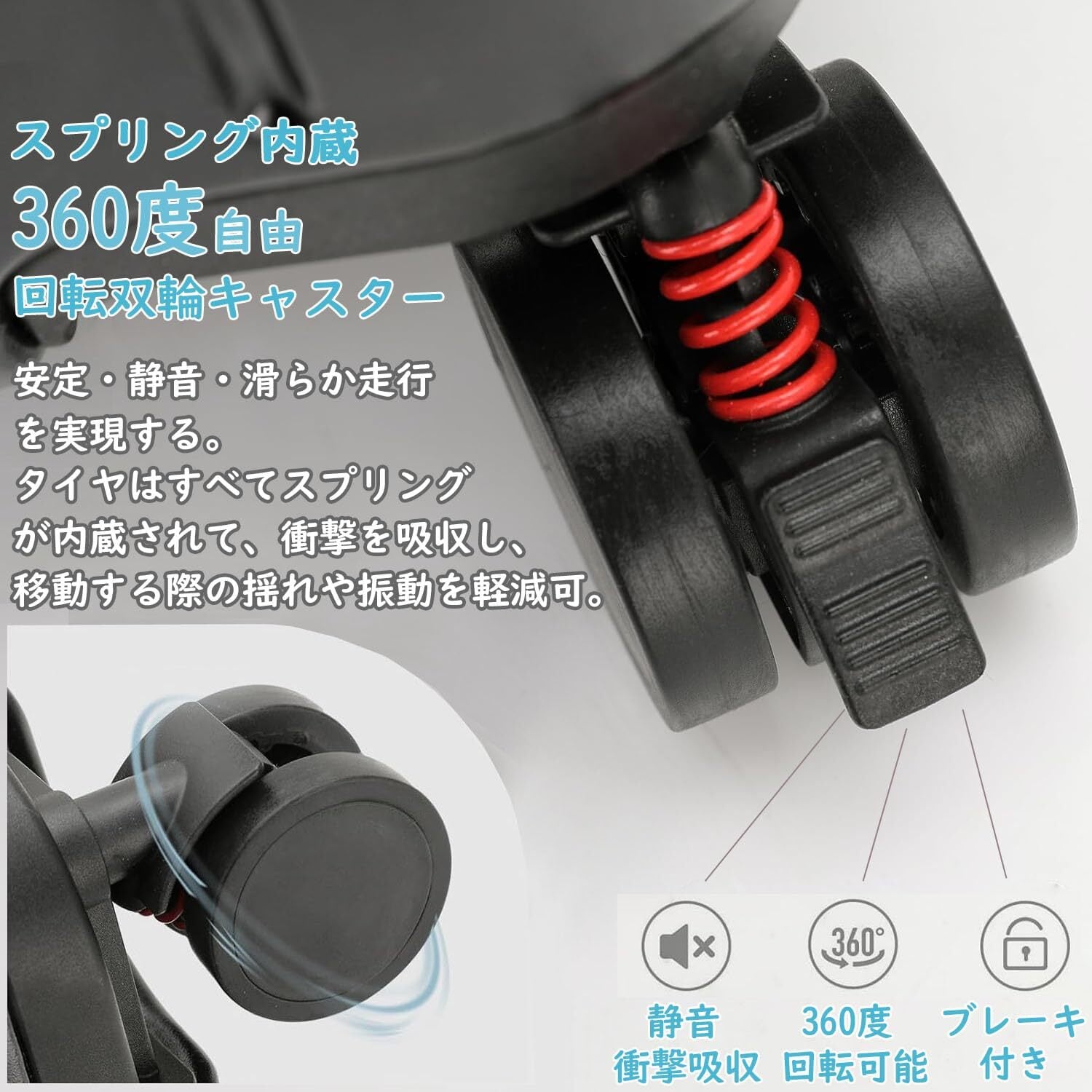 【双輪キャスター&多段調節可能キャリバー】 静かで耐久性の高い双輪キャスターは360度自由に回転でき、曲がるときや段差のある道でも安定して走行できます。故障しやすいシングルタイヤに比べ、安定感は抜群です。軽くて丈夫なアルミ製のキャリーバーは、ボタンを押すだけで高さを調整でき、身長や使う場面に合わせて簡単に多段階で変更できます。