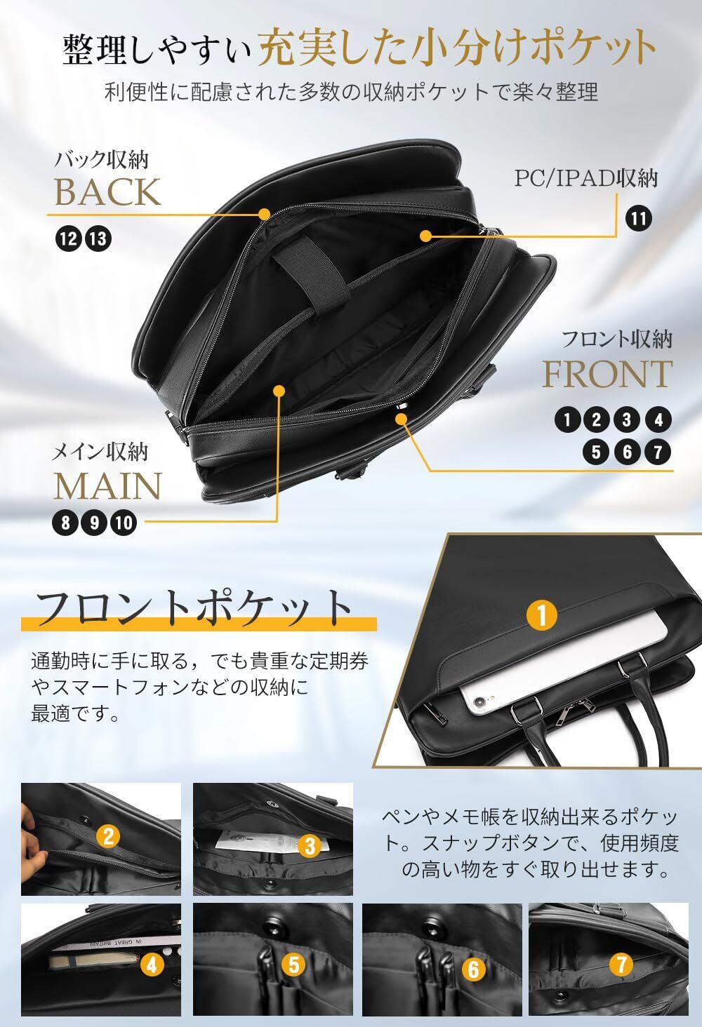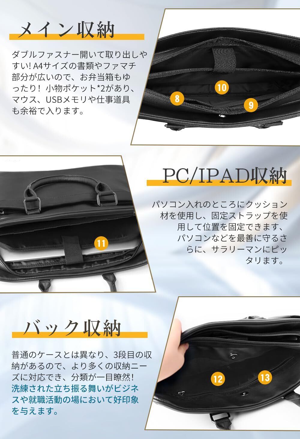 【2025新登場&大容量&13つポケット】2025新登場見た目以上にたっぷり入る大容量ビジネスバッグです。サイズ:H約30m ×L約11.5cm×W約39cm、ポケットの数:13個。独立したパソコンポケットがあり、15.6インチのノートパソコンと 11インチのiPadを完全に収納でき、身軽に通勤しましょう。セキュリティと利便性を兼備する複数のポケットがあり、物の整理整頓が簡単にできます。書類も水筒も弁当も、ペン、メモ帳、財布、スマホ、充電器などの出勤アイテムのためのポケットが集まるビジネスバッグです。普通のケースとは異なり、3段目の収納があるので、より多くの収納ニーズに対応でき、分類が一目瞭然!