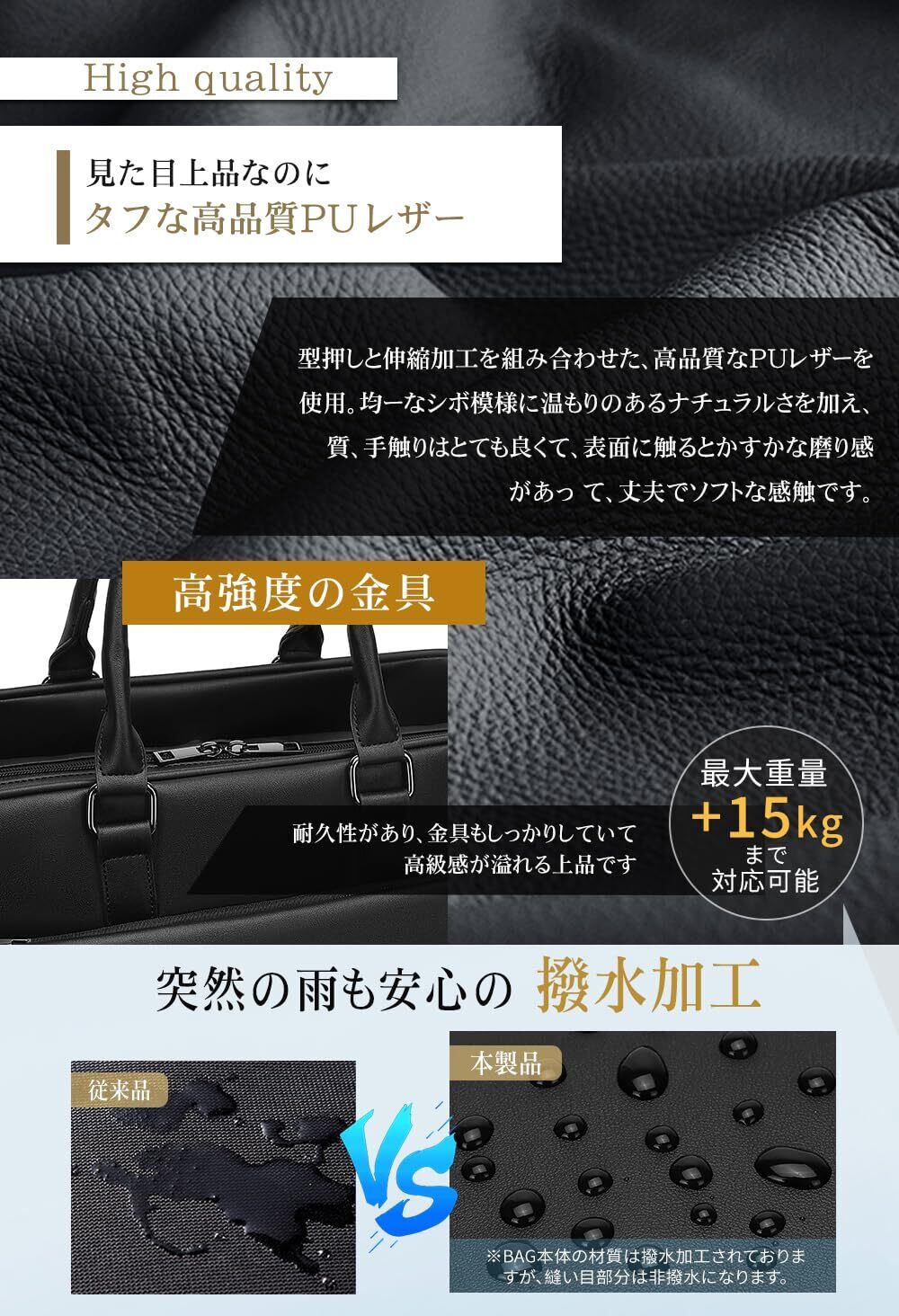 【軽量設計&3WAY使用便利】市販されている多くのこのサイズとこの大容量のビジネスバッグに比べて、かなり軽量化されています。毎日の通勤や移動を快適にする、軽量ながらしっかりした作りで、就活生や新社会人の忙しい日々をサポートします。本ビジネスリュックは、市販の一般的な2 wayのブリーフケースに比べて、スーツケースに置くことができる機能が追加され、出張が便利になり、両手を解放することができます。持ち手も普通のビジネスバッグに比べて15 cmに増やし、腕にのせやすくなっています。ショルダーベルトの長さは(83~150cm)調節でき、身長や性別の異なるお客様に適しています。通勤、就職、出張に最適なビジネスバッグ!!