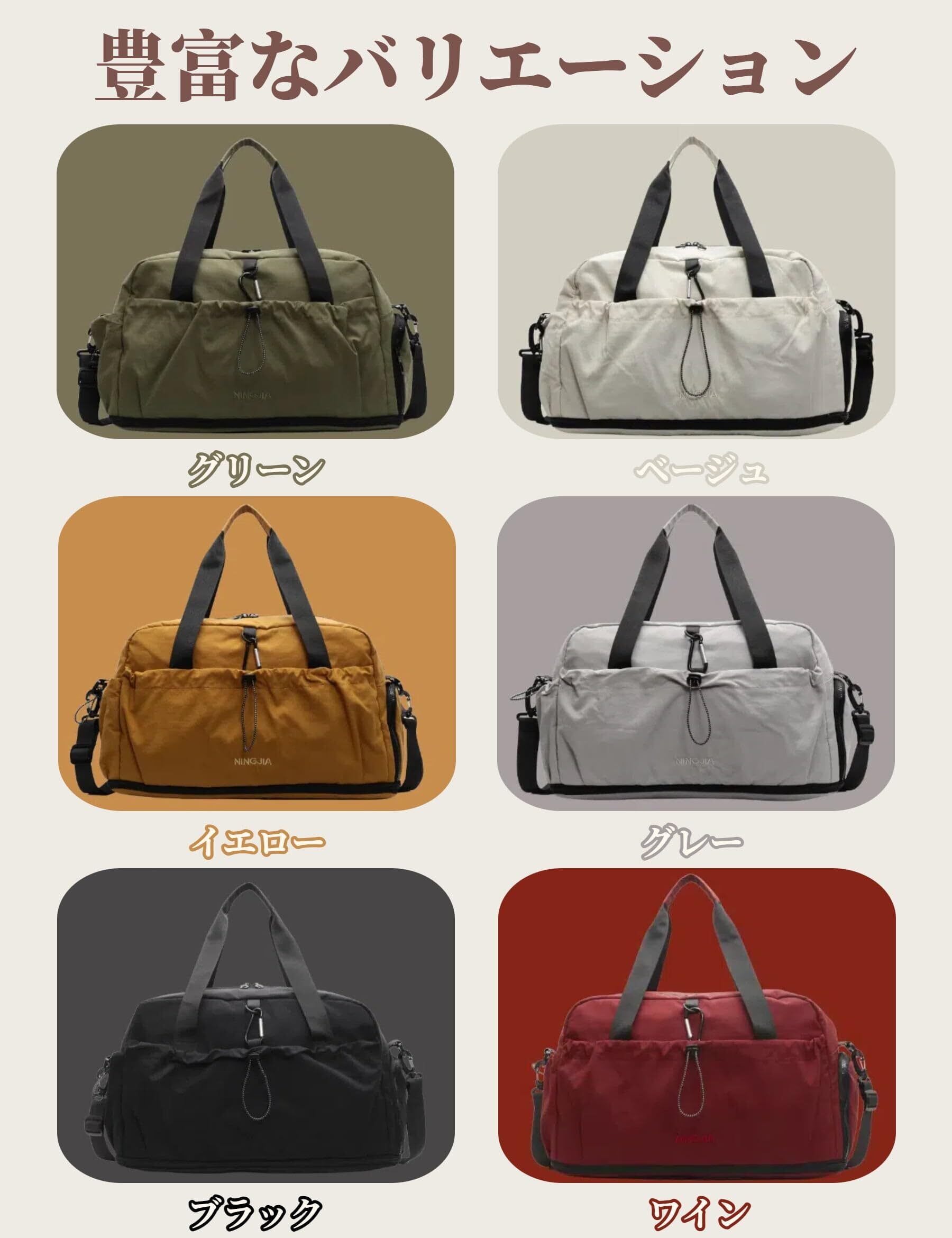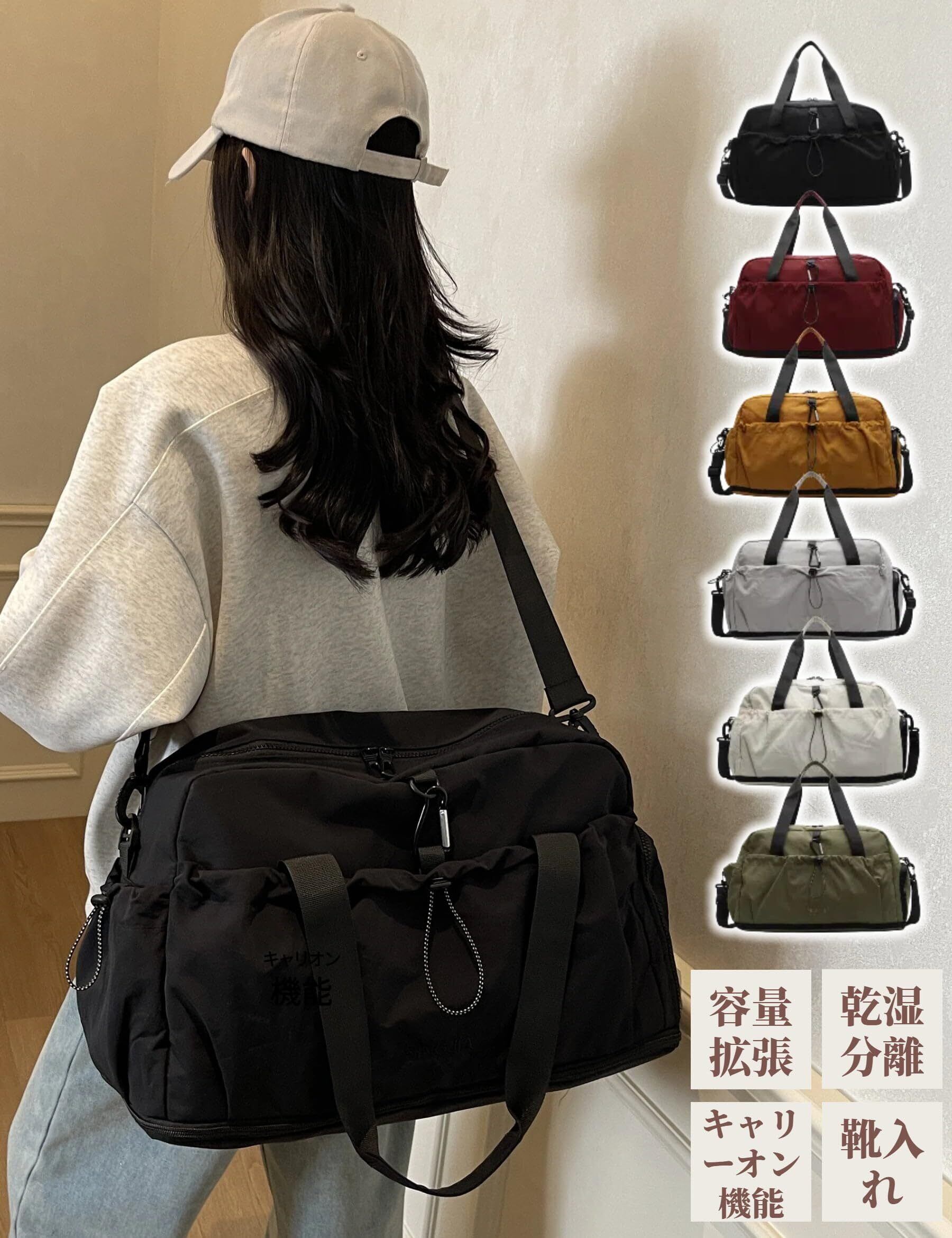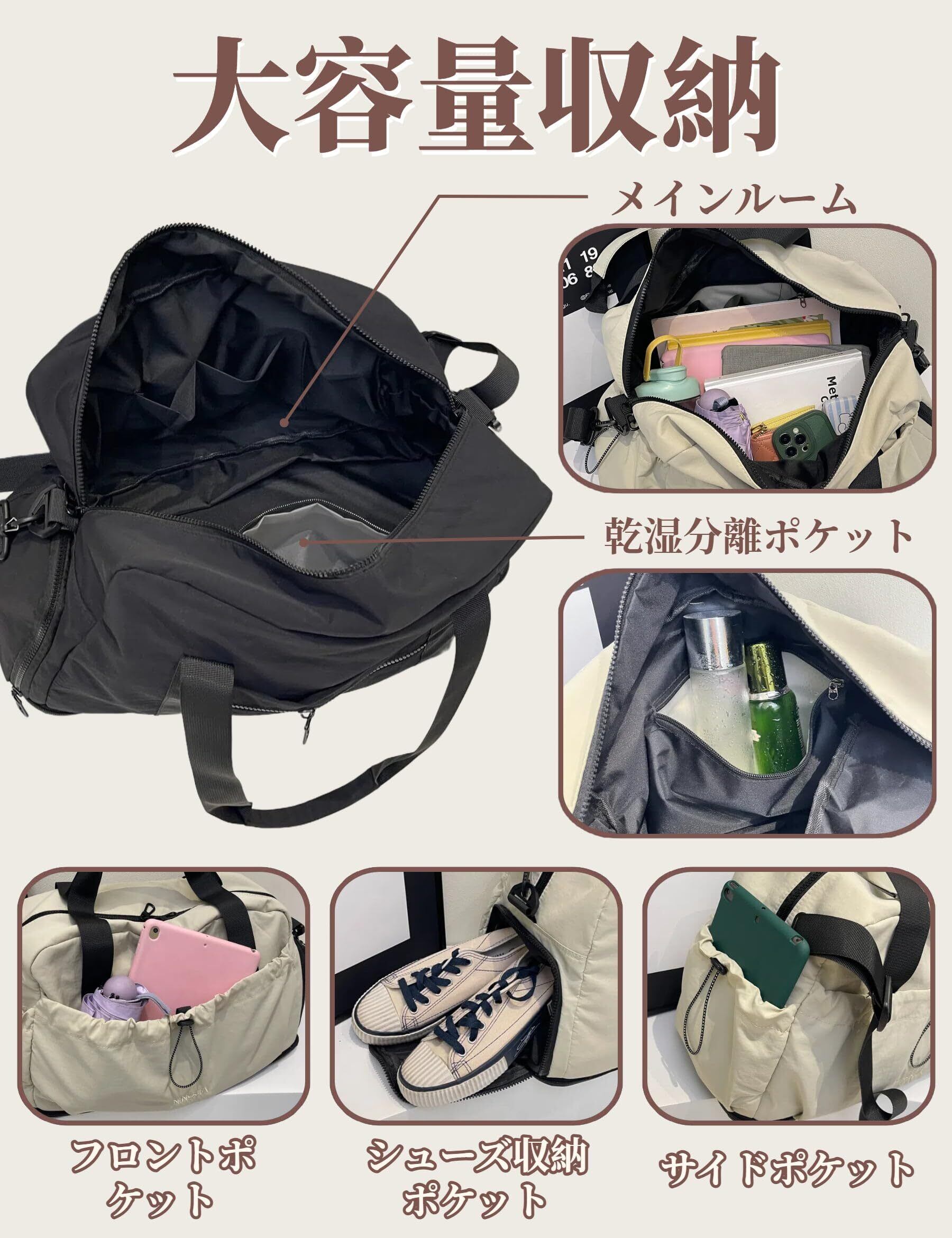 大容量・拡張可:このボストンバッグの基本サイズはタテ28cm×ヨコ48cm×マチ20cm、容量約25L。このままでも、1泊2日から2泊3日程度の小旅行や、毎日のジム通いに必要な着替え、タオル、シューズなどを余裕で収納できる頼もしいサイズ感です。しかし、このバッグの真価はこれだけではありません。底部のファスナーをさっと一周開けるだけで、縦がなんと12cmも広がり、容量が一気に約37Lへとアップグレード!急に荷物が増えても、旅先で素敵な出会いがあっても、もう収納スペースの心配は無用です。合計8つのポケットが、あなたの荷物を美しく整理整頓します。メイン収納はダブルファスナーで大きく開き、中身が一目瞭然。内側には、濡れたタオルや水着、洗面用具などを気兼ねなくしまえる防水仕様の「乾湿分離ポケット」と、スマートフォンやパスポートなどの貴重品を収納するのに便利な2つのオープンポケットを完備。前面にはドローコード付き巾着型収納ポケット、さらにヨガマットなどが固定できるD型カラビナ付きでアクティブなライフスタイルにも活躍。左側にはシューズ用の独立ポケット、右サイドと背面にも機能的なポケットが配置されており、小物の整理もスムーズです。