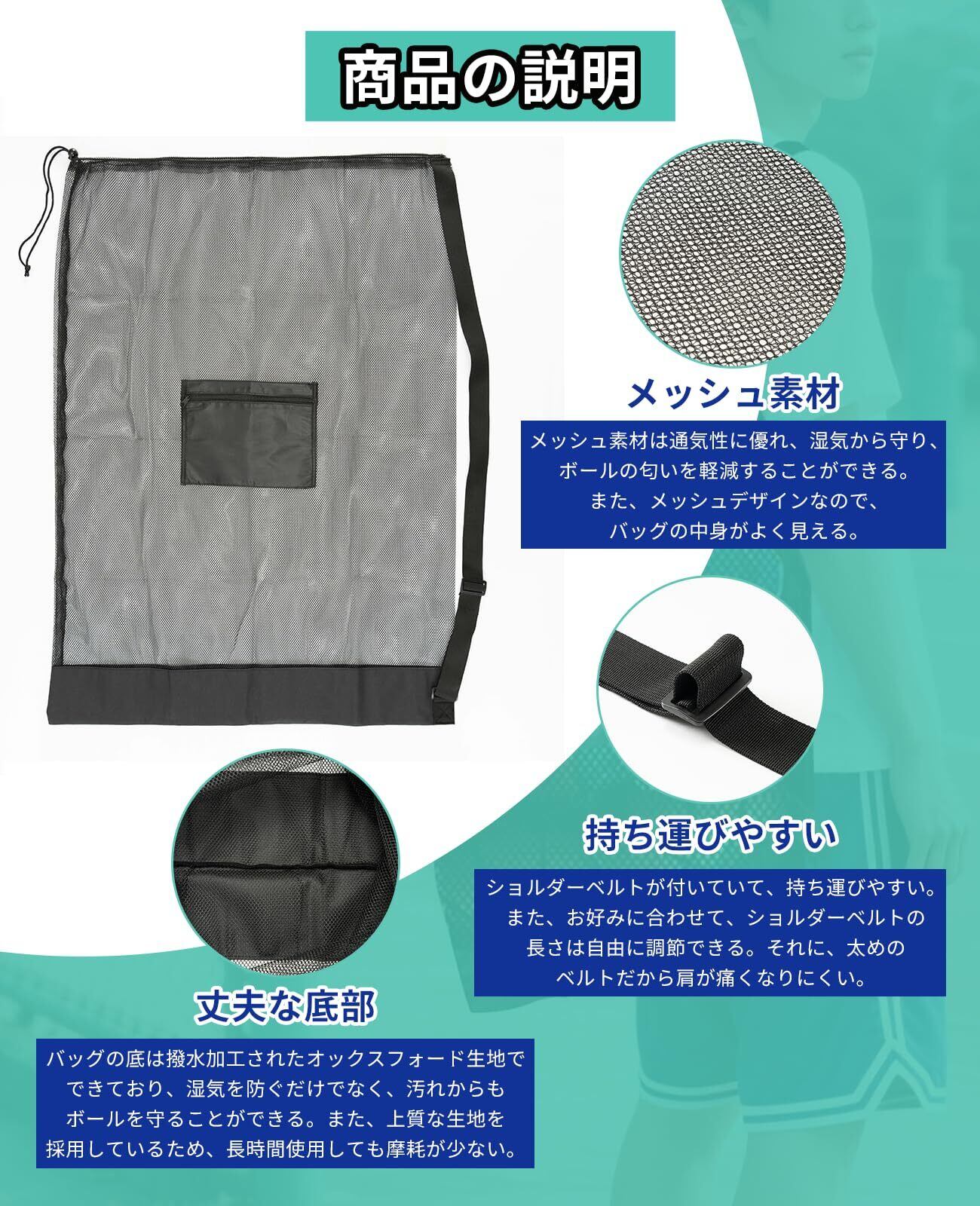 【優れた素材】ボールネットの底は撥水性のあるオックスフォード生地でできており(Bタイプにはない)、湿気だけでなく汚れからもボールを守れる。また、ボール入れ本体は良質のメッシュ生地でできており、通気がよく、丈夫で長持ちし、耐摩耗性に優れている。さらに、メッシュデザインなので、ボール 袋の中身がよく見える。