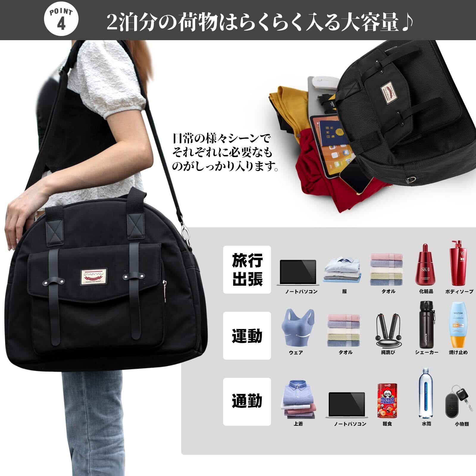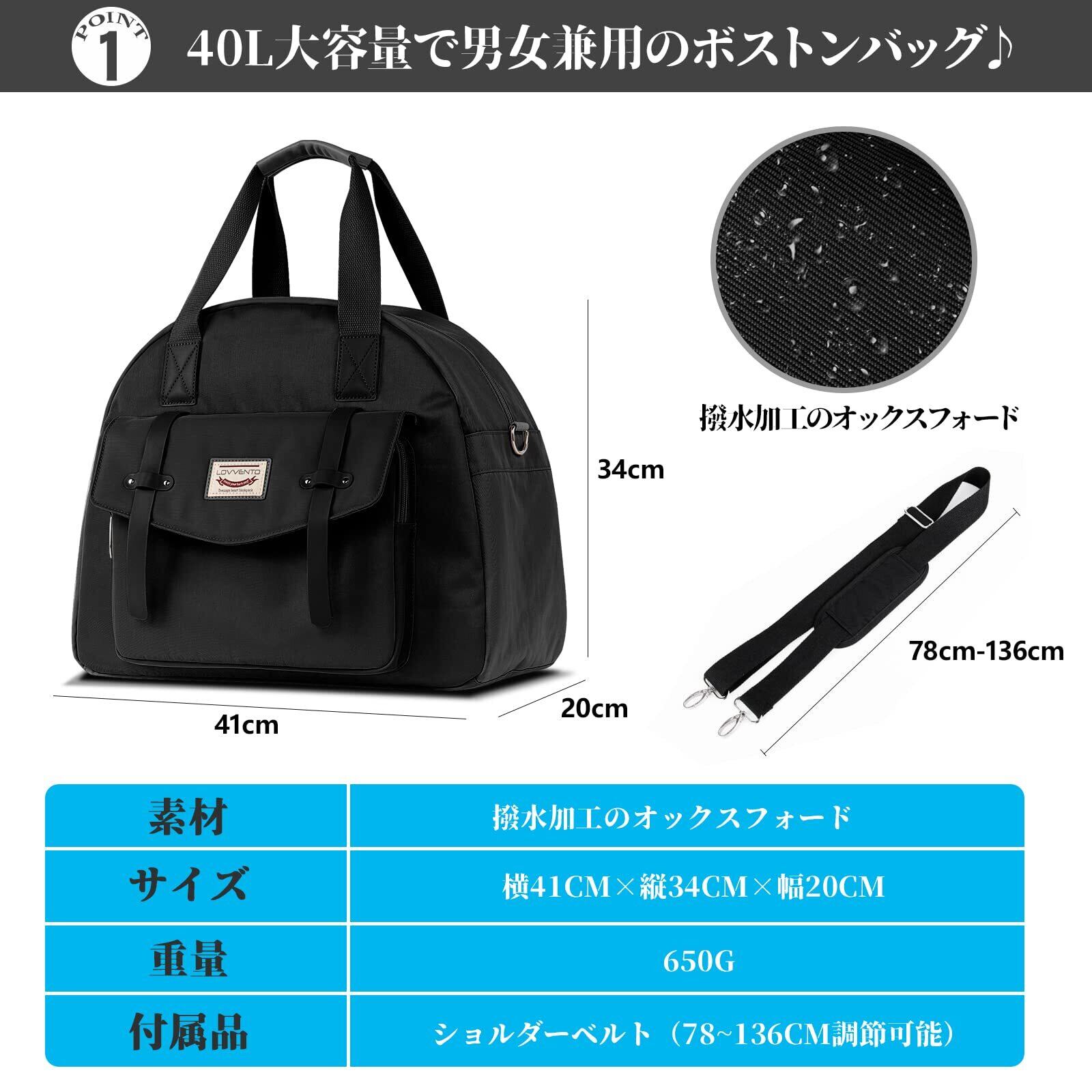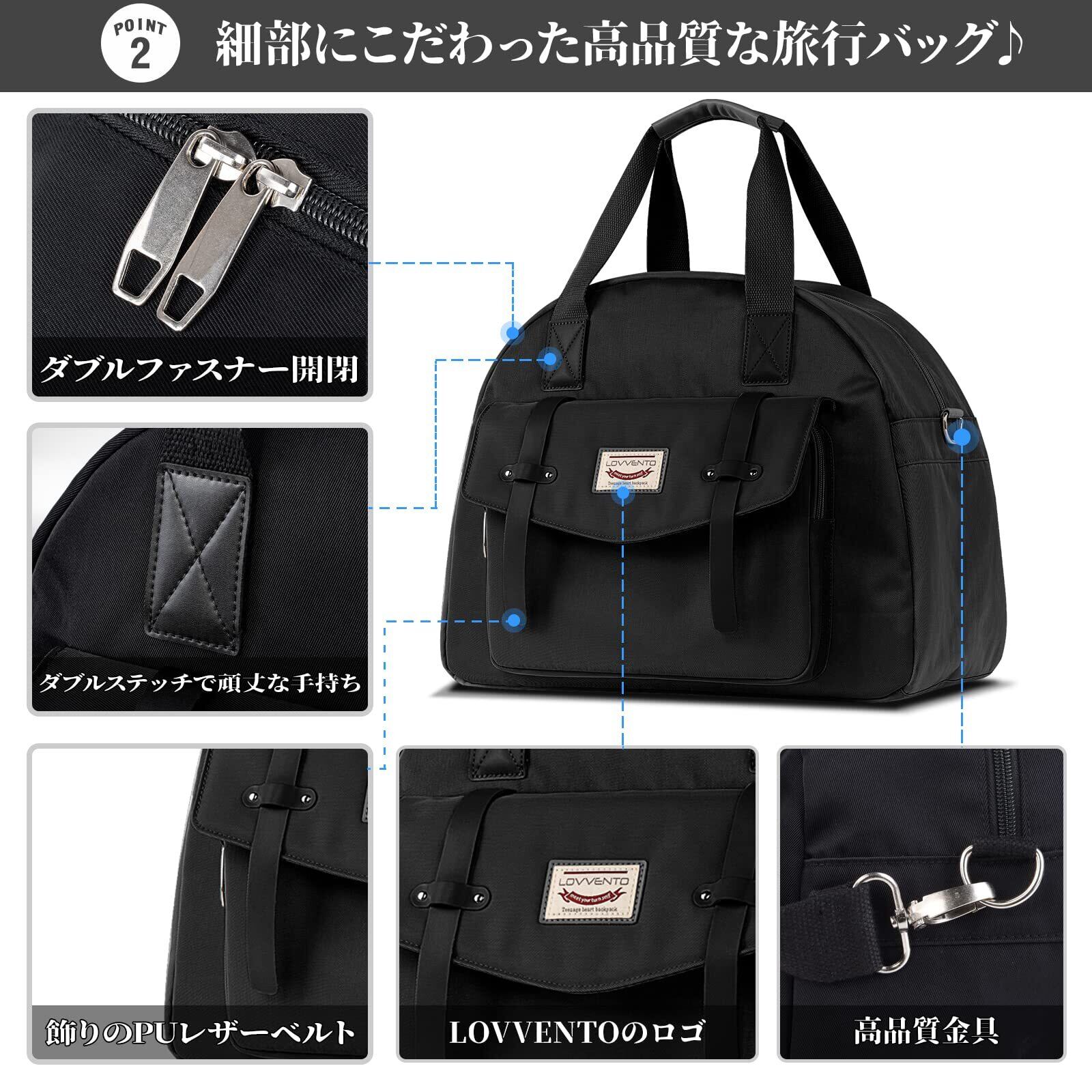 LOVVENTO ボストンバッグ レディース 可愛い マカロン色 3way 手提げ 斜め掛け 肩掛け トラベルバッグ 大容量 軽量 2泊3日 30L おしゃれ 通勤 通学 旅行 機内持ち込み ショルダーベルト付き 撥水加工 (ブラック)