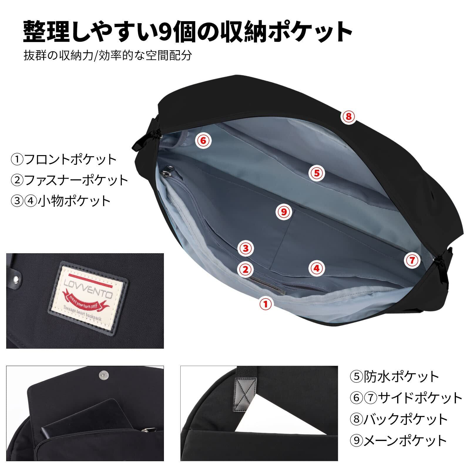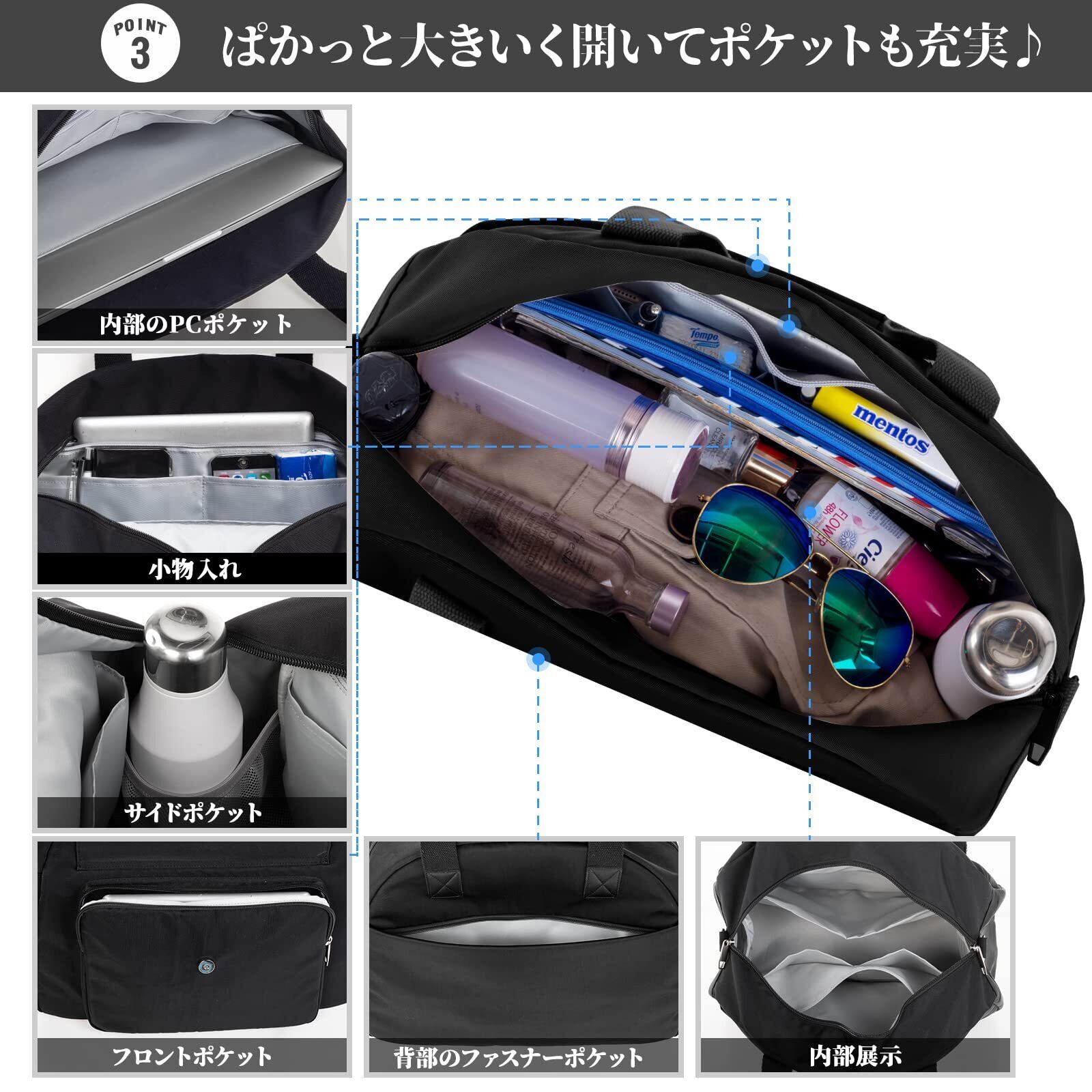 大容量収納&安心な9ポケット:①サイズ:横41cm×縦34cm×幅20cm(9ポケット/30L)②外部にメインポケット*1、フロントポケット*1、バックファスナーポケット*1/内部にファスナーポケット*1、オープンポケット*3、サイドポケット*2。③メーンポケットはダブルジッパーを付いて、 ボストンバッグのポケット口を最大限に開いて、荷物の出し入れしやすいです。④メインポケットの他に濡れた荷物(衣類・小物)を収納できる防水ポケットがあります。⑤9つのポケットは、15.6インチPCパソコン、A4ファイルや書類、衣服、スマホ、充電器、長財布、折畳傘、などの荷物を収納できます。