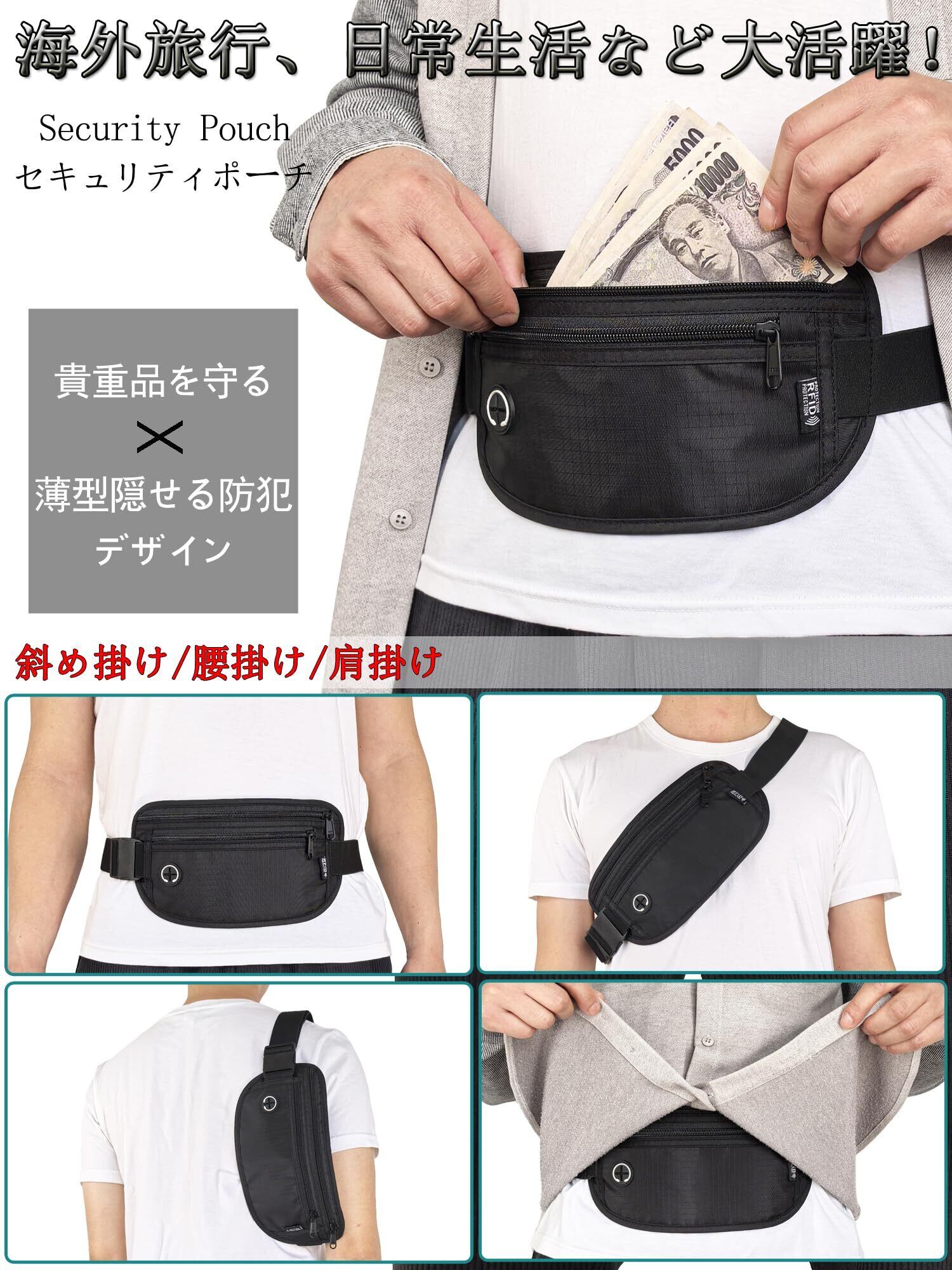 【RFID保護!隠せる防犯デザイン】近年国内外で多発しているスキミング「カード犯罪」(外部から特殊機器を使用しクレジットカードやICカード情報を盗み取る犯罪)。このセキュリティポーチはシンプルですが、機能をぎゅっと詰め込んで作った腹巻きタイプのセキュリティぽーちです!セキュリティぽーち機能が貴重品を守るポーチ!スキミング防止ポケットを搭載、スキミングを遮断して。個人重要情報の安全性を確保する!<ご注意ください> スキミング防止(RFIDブロック)素材は上側ファスナーポケットの「カード収納ポケット」のみ使用しております。その他の収納部分につきましては電波の遮断はできません。