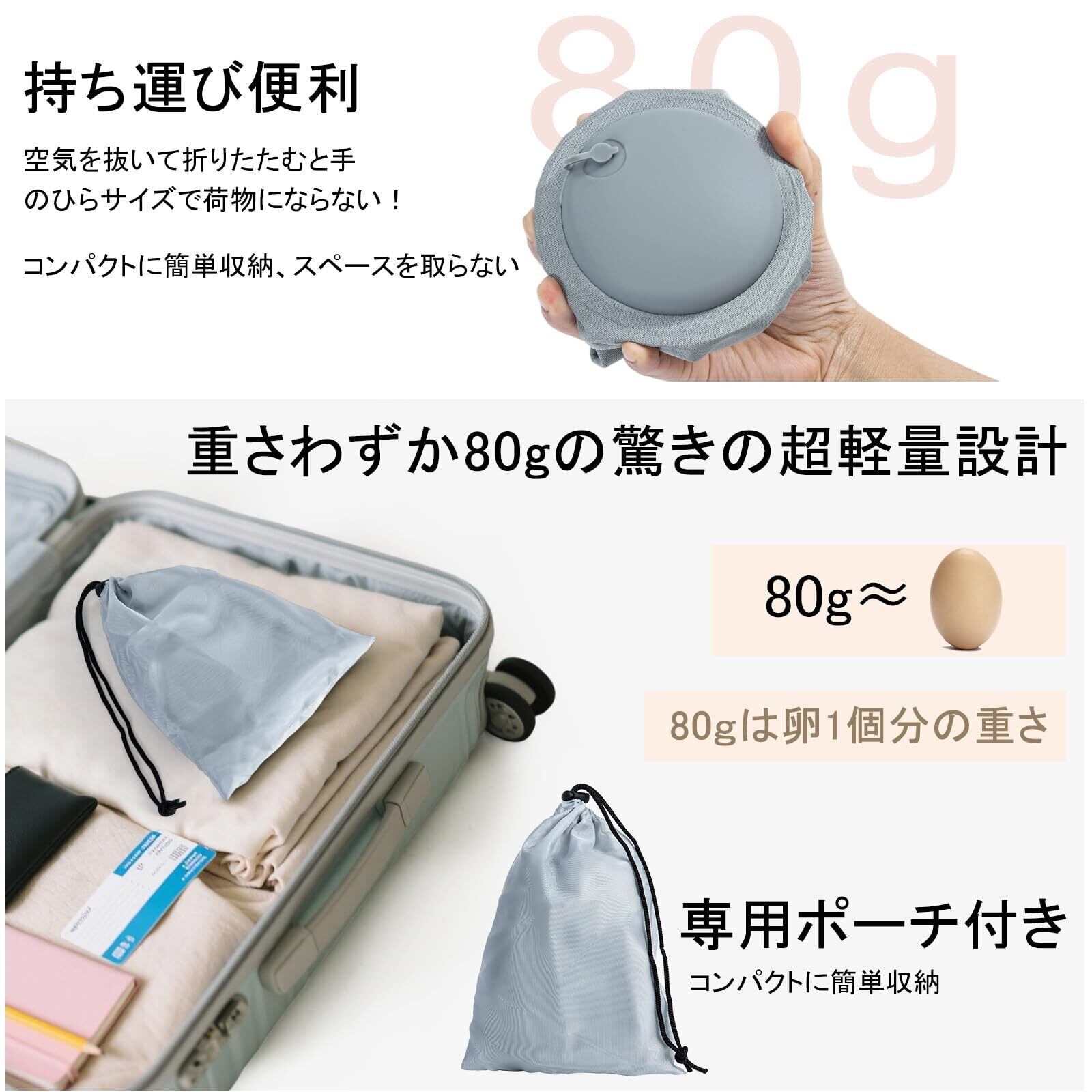 【超軽量&コンパクト】 エアータイプで畳めば手のひらサイズに収まるほどコンパクトに。重さも約80g、カバンやリュックの隅にさっとしまえるので、持ち運び便利なのはもちろん、収納スペースもほとんど取りません。出張や旅行の際に気軽に携帯できる便利グッズです。