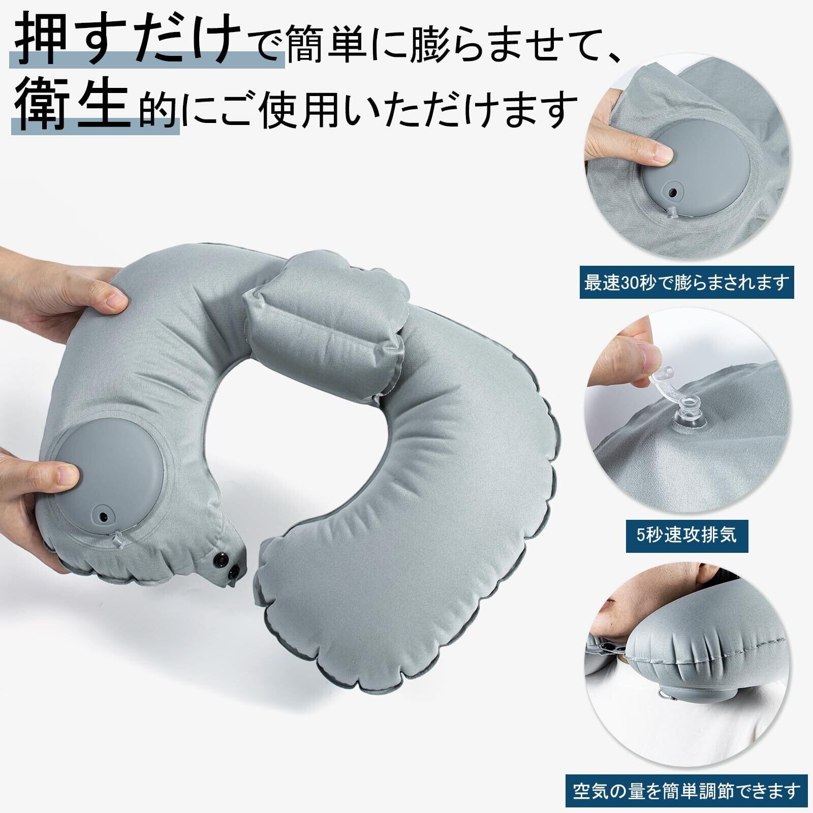 ネックピロー U型まくら 首枕 エアー枕 空気枕 携帯枕 ポンプ コンパクト 軽量 飛行機 車 トラベル 旅行用 便利グッズ 快適グッズ 収納ポーチ付き グレー