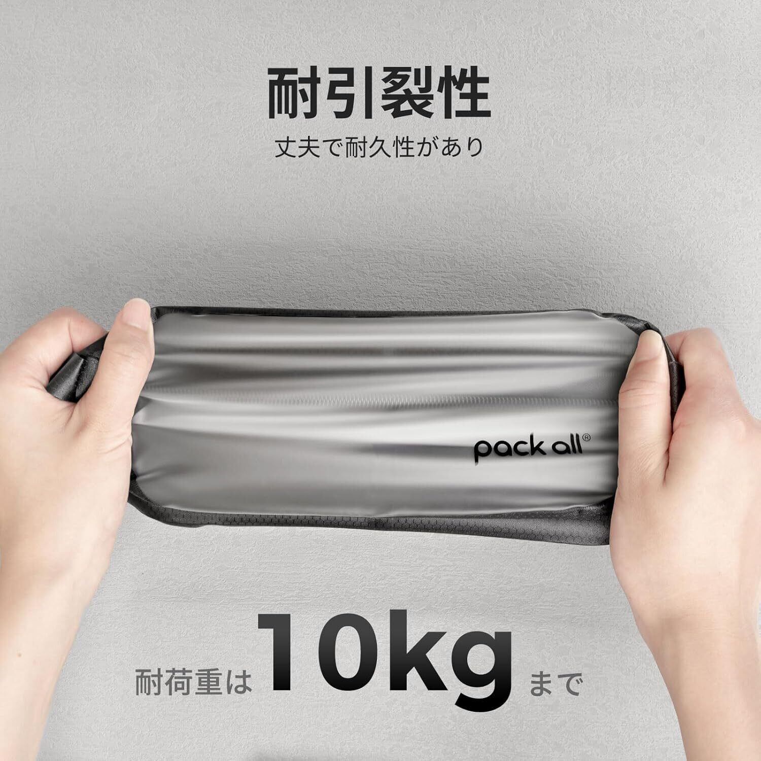 [耐久性・耐引裂性] アンチスクラッチ、耐摩耗性、弾力性、耐引裂性、老化や黄変しにくい。シームレスな溶接技術により、ハンドル部の耐荷重は8kgまで。