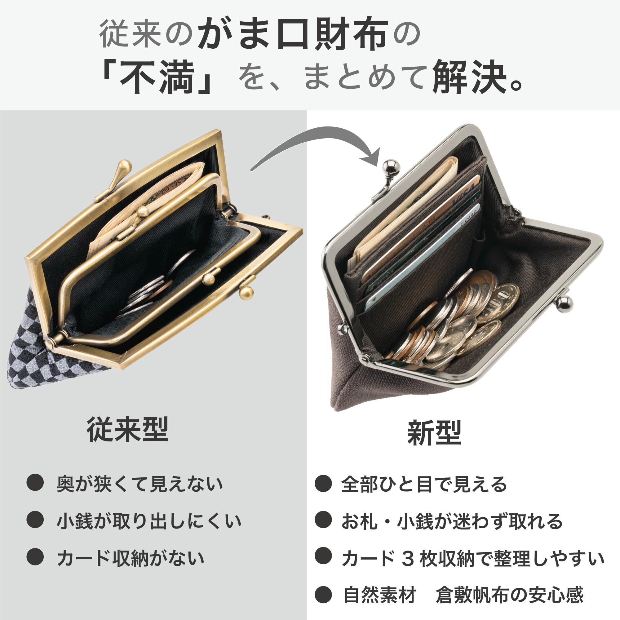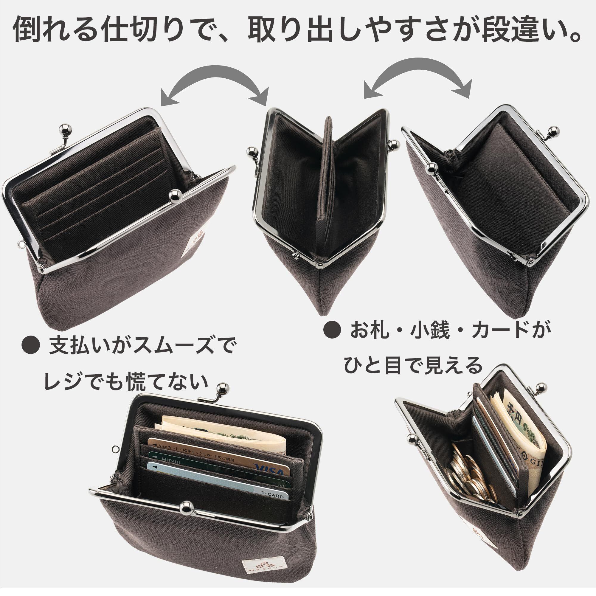 毎日の支払いが驚くほどスムーズになる、watonaの新作がま口財布。 最大の魅力は、小銭が一目で見える「可動式仕切り」構造。 がま口を開けた瞬間、硬貨の位置がぱっと分かり、 探さずサッと取り出せる“ストレスゼロ”の使い心地を実現しました。 内部には可動式の仕切りに加え、カードポケット3ヶ所を装備。 折りたたんだお札も入り、コンパクトながら収納力は十分。 普段使い・お出かけ・旅行用のサブ財布としても大変便利です。 素材には、耐久性と風合いの良さで人気の倉敷帆布(8号・綿100%)を使用。 使うほどに味わいが増し、手になじむ柔らかさが魅力です。 裏地には丈夫なカツラギ生地(綿100%)を採用し、 内側までしっかりと仕上げています。 口金は高級感のあるブラッククロームメッキ。 職人が調整した開閉は、軽く開いて「パチン」と気持ちよく閉まる操作性。 70gの軽量設計で、バッグやポケットの中でもかさばりません。 落ち着いたカラーとシンプルなデザインで、年齢を問わず使いやすく、 プレゼントにも喜ばれる実用的なミニ財布です。