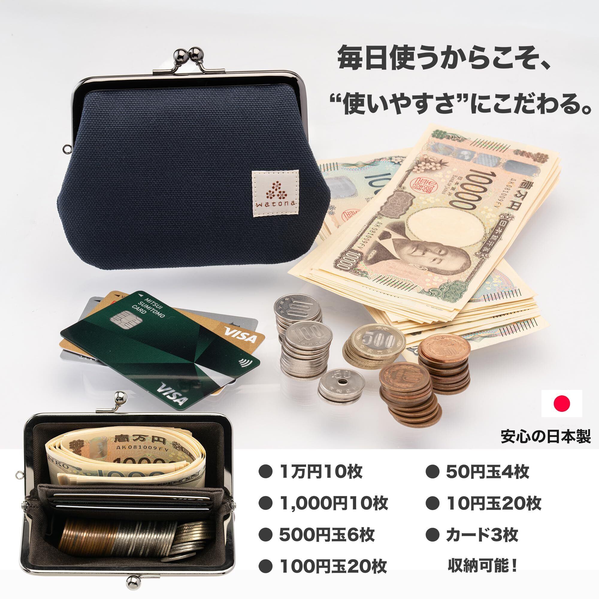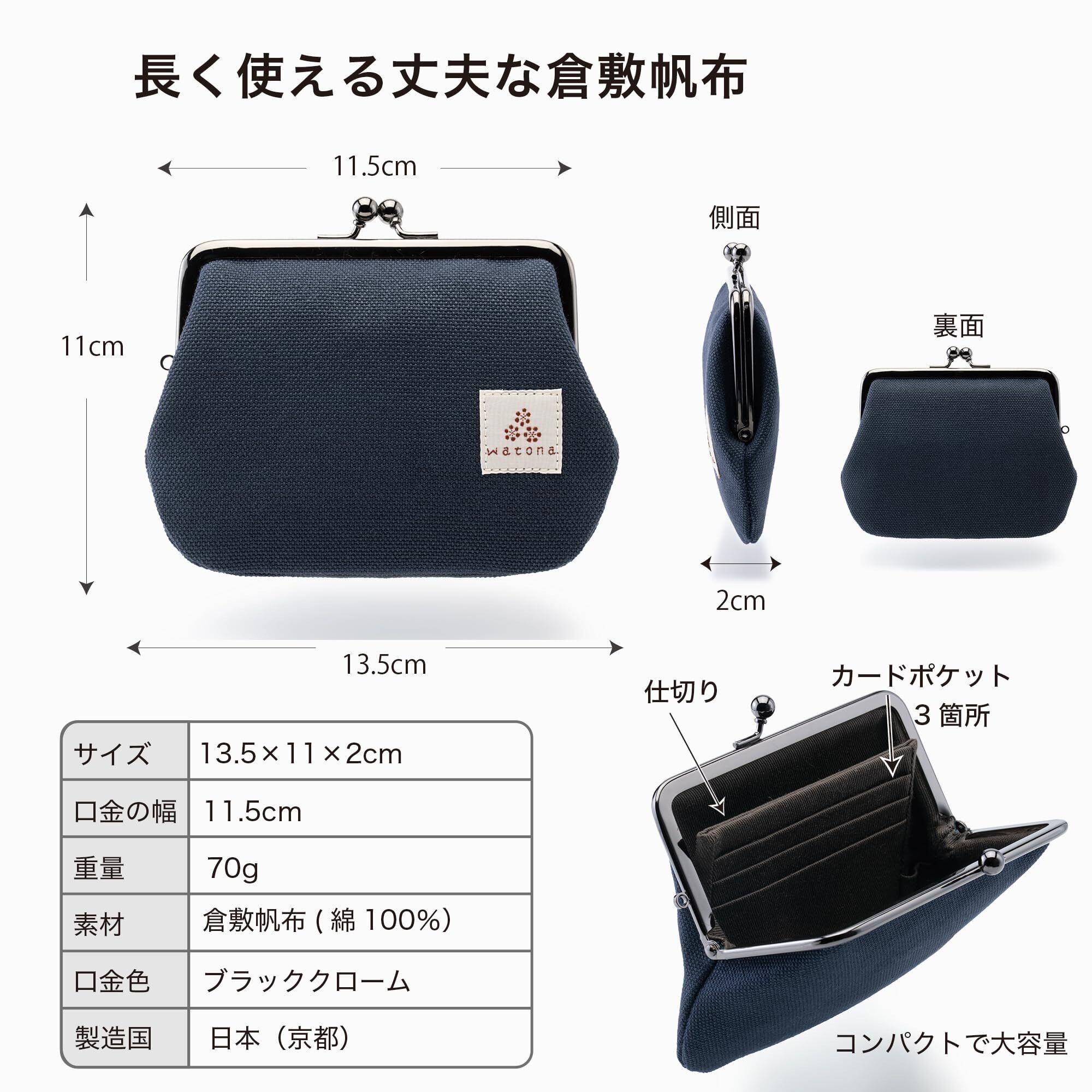 【素材】表地:倉敷帆布(8号・綿100%)/裏地:カツラギ生地(綿100%)/口金:鉄製・ブラッククロームメッキ。【サイズ】横幅約13.5cm・高さ約11cm・厚み約2cm・重量約70g。【収納】可動式仕切り1つ、カードポケット3つ、カード数枚収納可、2つ折り札収納、小銭が見やすいワイド開口。【特徴】小銭が探しやすい構造でレジ前でも素早く支払い可能。仕切りが倒れて取り出しやすく、軽量コンパクトで普段使いに最適。落ち着いた帆布カラーで男女兼用、ギフトにも好評。【ブランド】watona(京都のがま口ブランド)。【使用シーン】日常・お出かけ・旅行・サブ財布に。