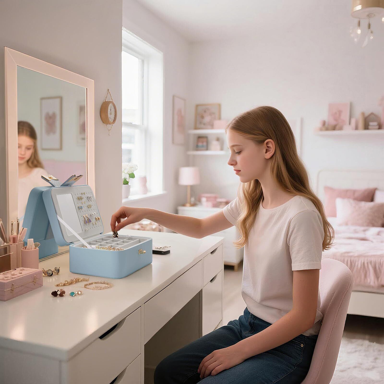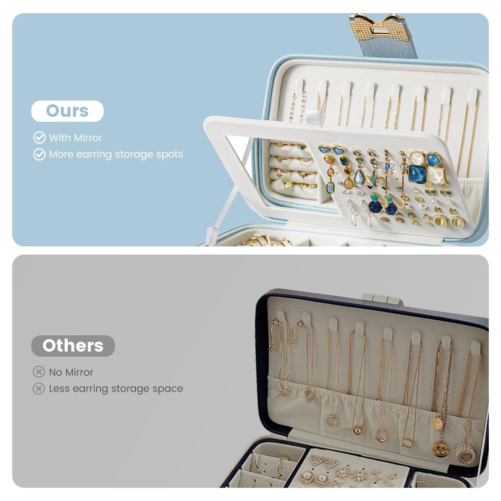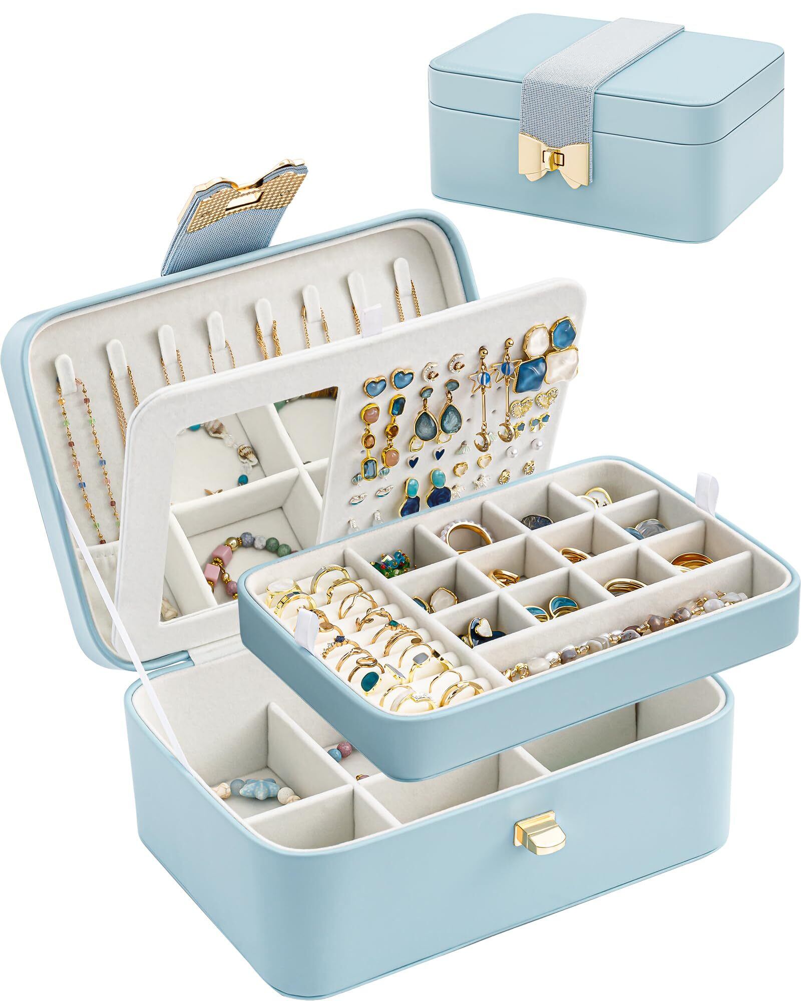 Lolalet ジュエリーボックス アクセサリーケース 旅行・携帯用 ミラー付き 女性 女の子 イヤリング ブレスレット ネックレス 時計 指輪 -ブルー