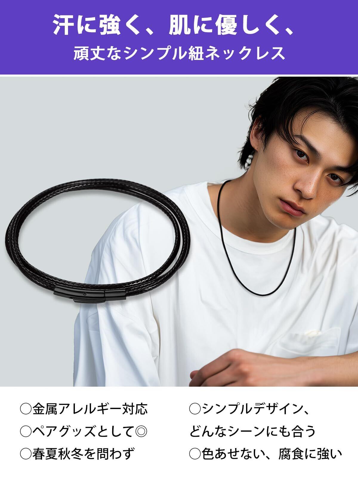 【人気な紐ネックレス】汗や水に強く、肌に優しく、頑丈なシンプル紐ネックレス!チェーンネックレス全体は高級なワックスコードを採用します。「ワックスコード」とは紐やポリエステル素材の表面にワックスを塗ることで耐久性が上がり、ほどけにくくなります。●ワックスコードチェーンの特性:①柔らかくい、肌に優しい;②水に強い、濡れても大丈夫;③耐久性優れた、フェードしません。 紐ネックレスの特徴として水をはじく性質があるため、海やプールなど夏のレジャーにつけていても長くお使い頂きます。