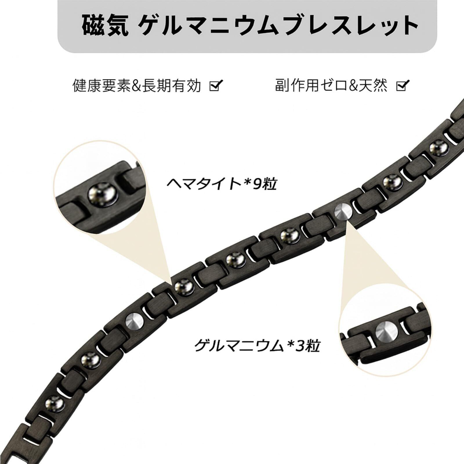 ブレスレットのプロパティ - ブレスレットの長さ:20 cm、幅:7.8 mm、色:ブラック、裏面の元素:純度99.99%ゲルマニウム*3粒+ヘマタイト*8粒、材質:純チタン、重さ:20 g、サイズ調整ツールを贈り、1.5 cmの追加リンクを贈る
