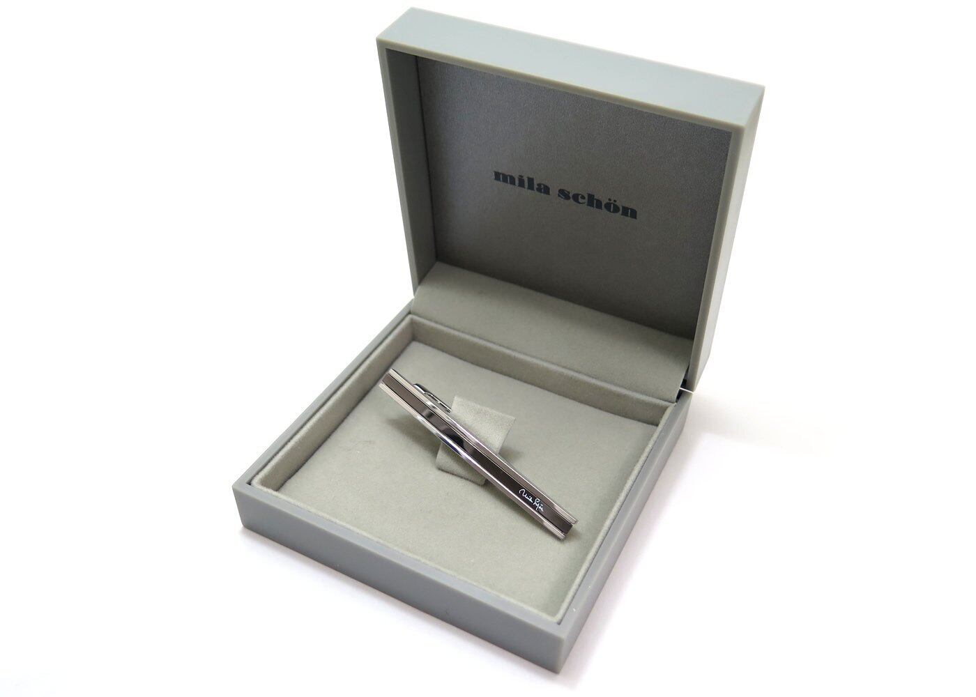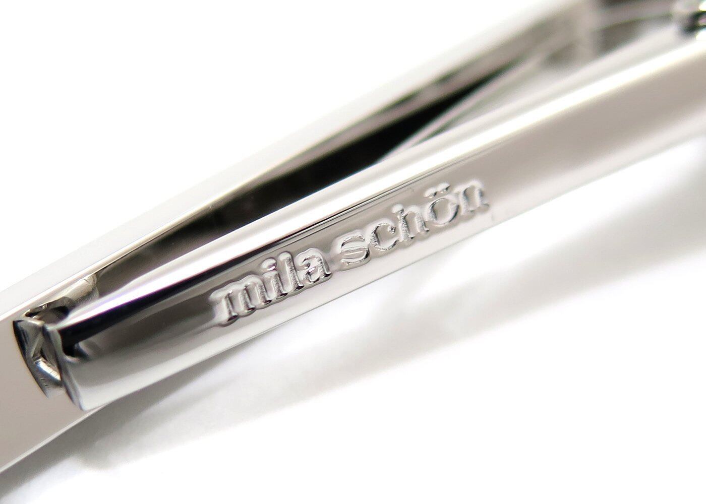 デザイン: 現代的なデザインで、メタリックな硬いイメージを和らげるポップなフォントでワンポイントに描かれた「mila schon」の文字が特徴です。