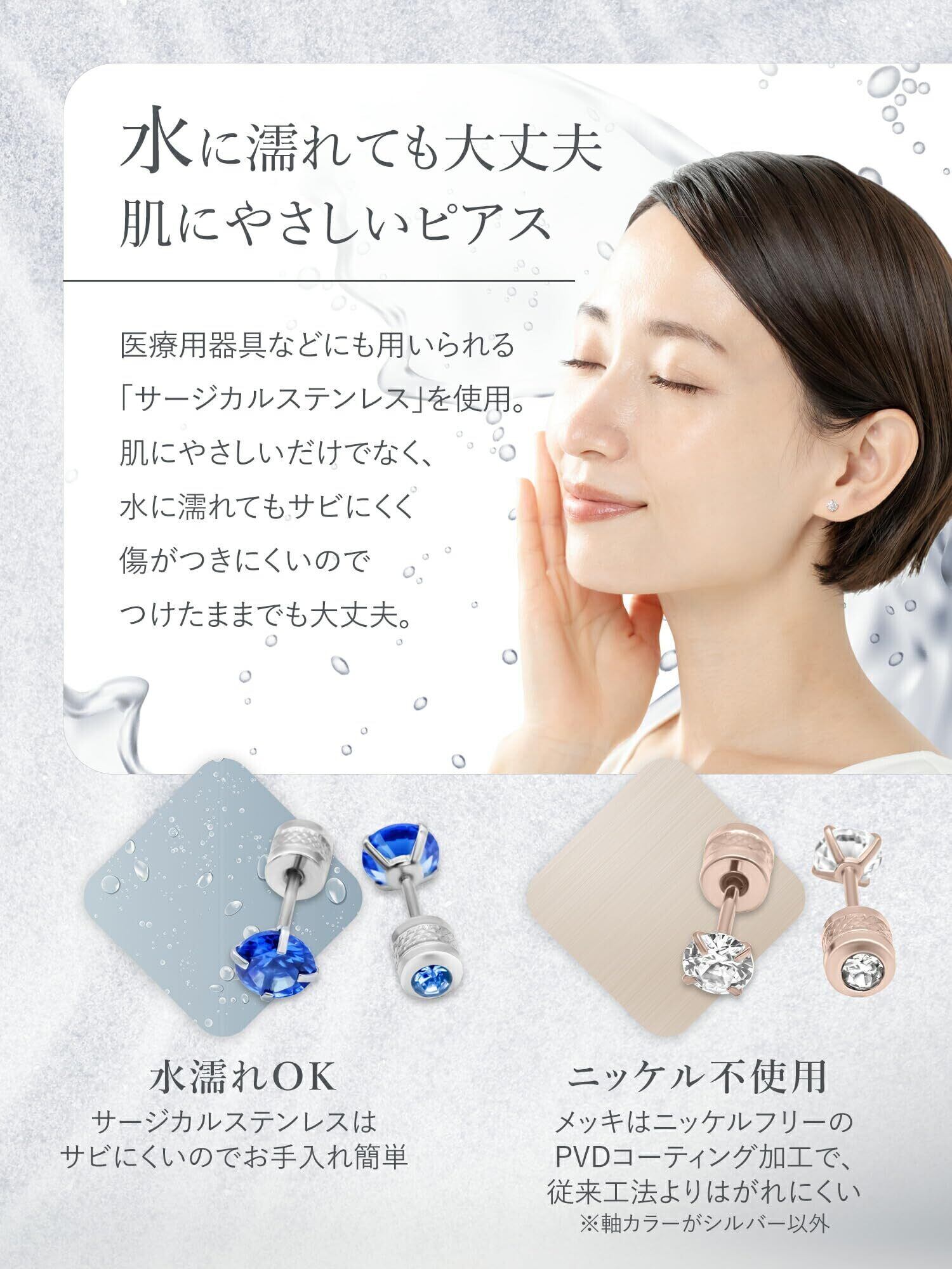 【失くさない、痒くならない。毎日つけっぱなしOK】キャッチがネジ式(スクリューバック)だから、外れて無くす心配が少なく、お風呂や就寝時もそのままで安心。サージカルステンレス製なので、金属アレルギーが気になる方にもやさしく、赤みやかゆみを気にせず毎日つけられます。