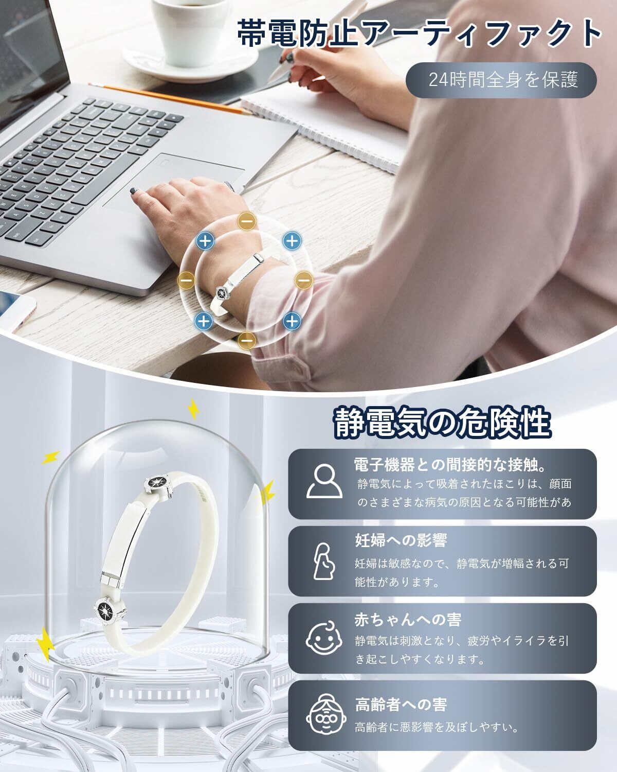 負のイオンを放出します:2-3周間で静電気が減りますので、少なくとも1周間は着用してみてください。着用時間が長くなるにつれて、効果はどんどん良くなっています。