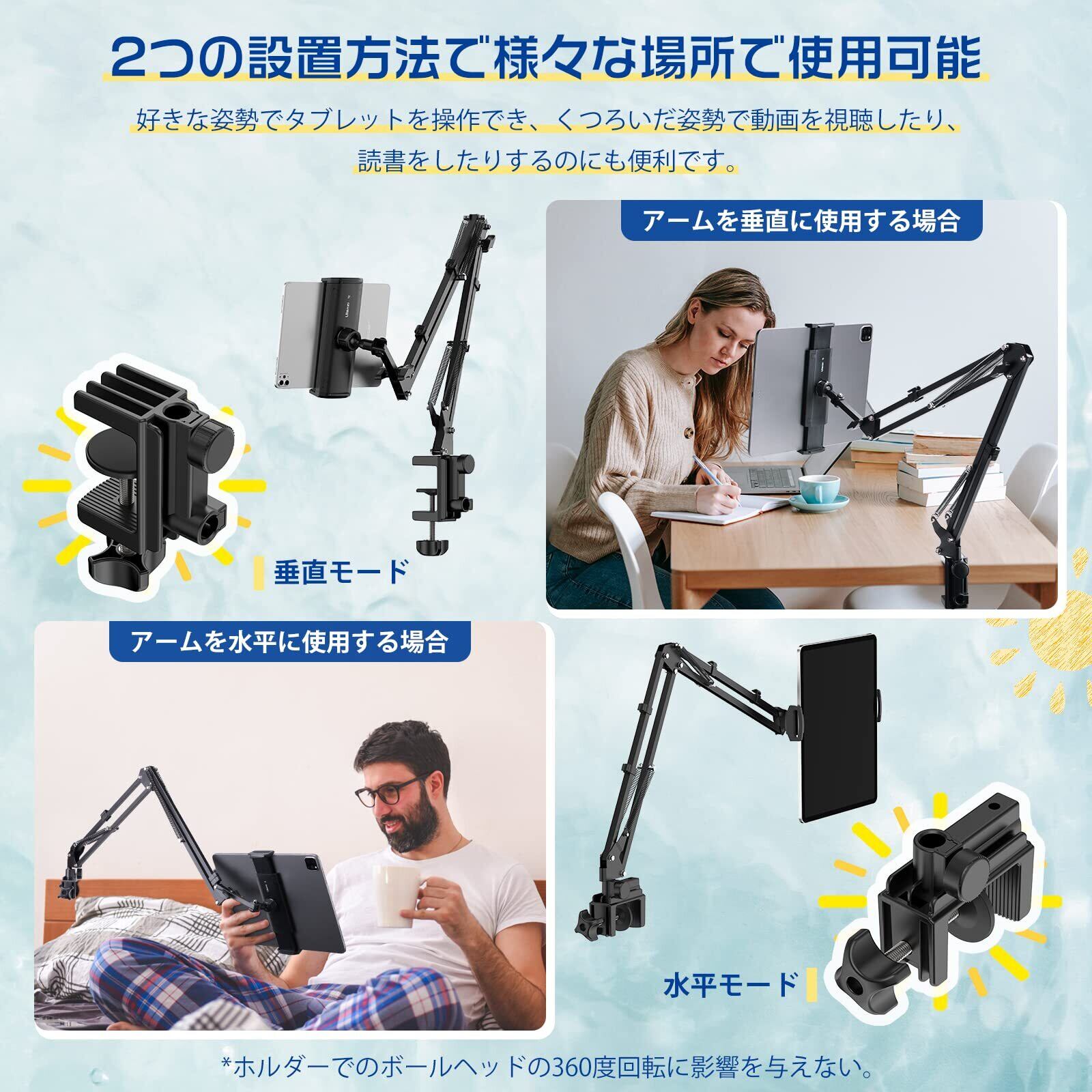 【自由に調整】ホルダー部には360度ボール雲台があり、エクステンションチューブを取り付けた部分は180度回転するため、見やすい角度調整がより詳細に行うことができるタブレットアームになります。 まだ、3段式のアームは120度から240度の間で自由に調整でき、フレキシブルアームは上下・左右・前後に調整することができます。 高さや角度を自在に変えられるで、好きな姿勢でタブレットを操作できます。くつろいだ姿勢で寝ながら動画視聴やWeb会議、在宅勤務、オンライン授業など、さまざまなシーンで利用できる便利なタブレット スタンドです。