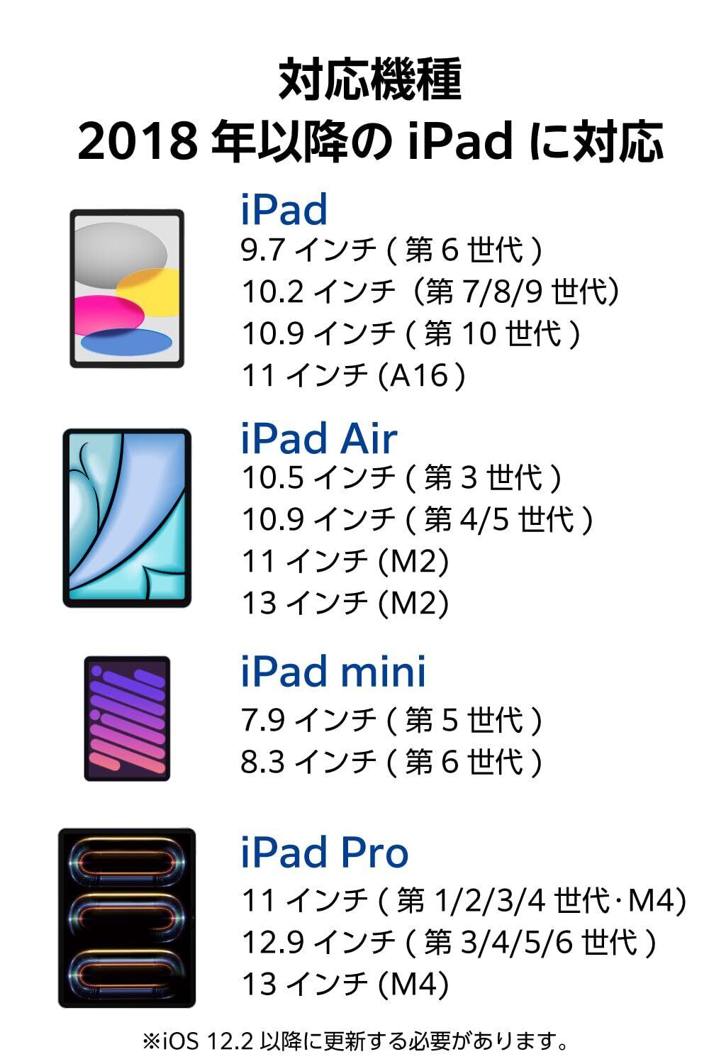対応機種: 2018年以降のiPadに対応(一部機種を除く) ※iOS 12.2以降に更新する必要があります。※2018年以前発売のiPadには対応しません。※2025年5月現在。iPad mini A17 Proモデルにも対応しております。