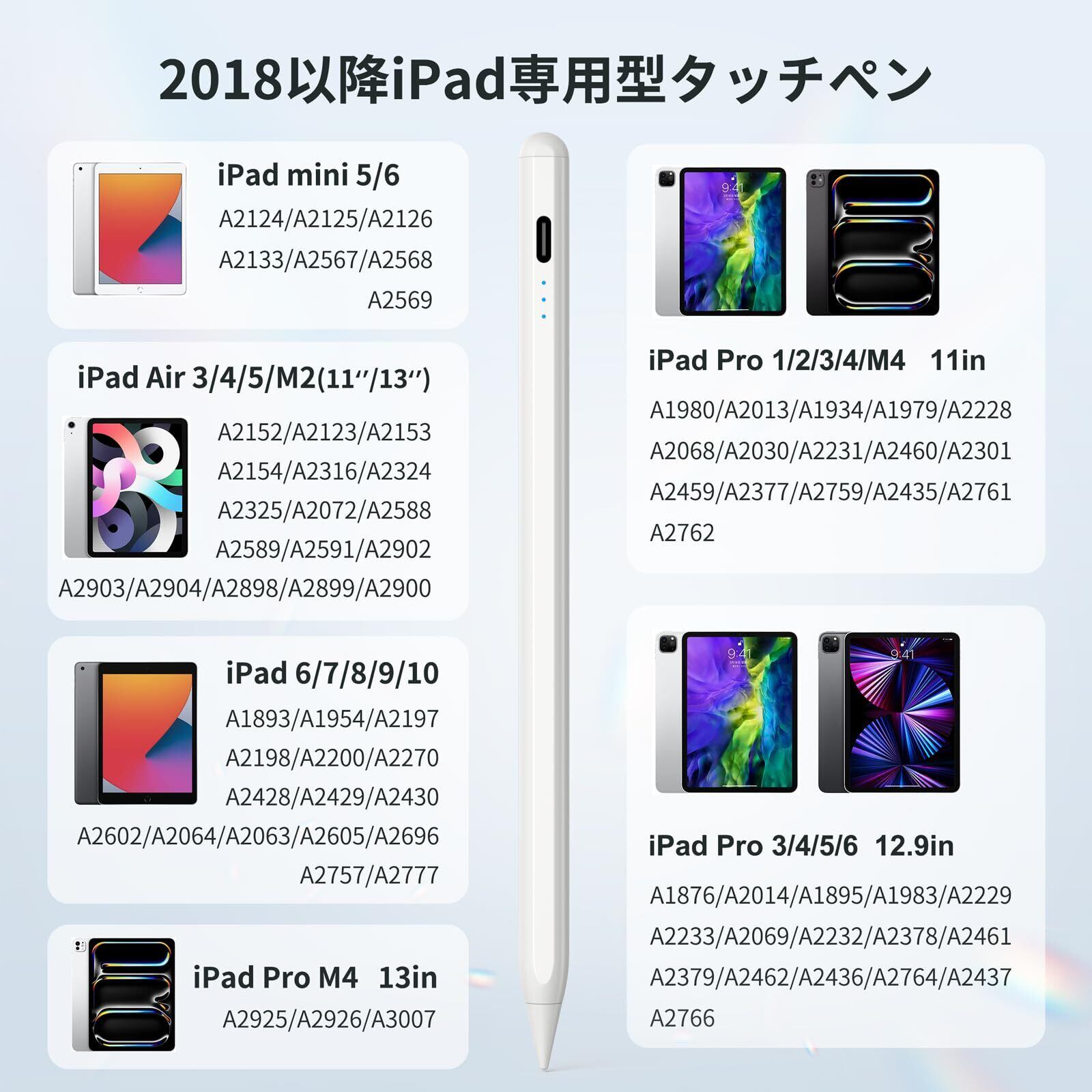 【2018年以降のiPad専用タッチペン】対応機種:iPad (第6/7/8/9/10世代)、iPad Pro 12.9” (第3/4/5/6世代) 、iPad Pro 11”(第1/2/3/4/M4世代) 、iPad Pro 13"(第M4世代)、iPad Air (第3/4/5/M2世代) 、iPad mini (第5/6世代)。(※注意:上記の型番以外のiPadでは利用することができません。利用するには、iPadモデルをiOS13.1以降に更新する必要があります。)