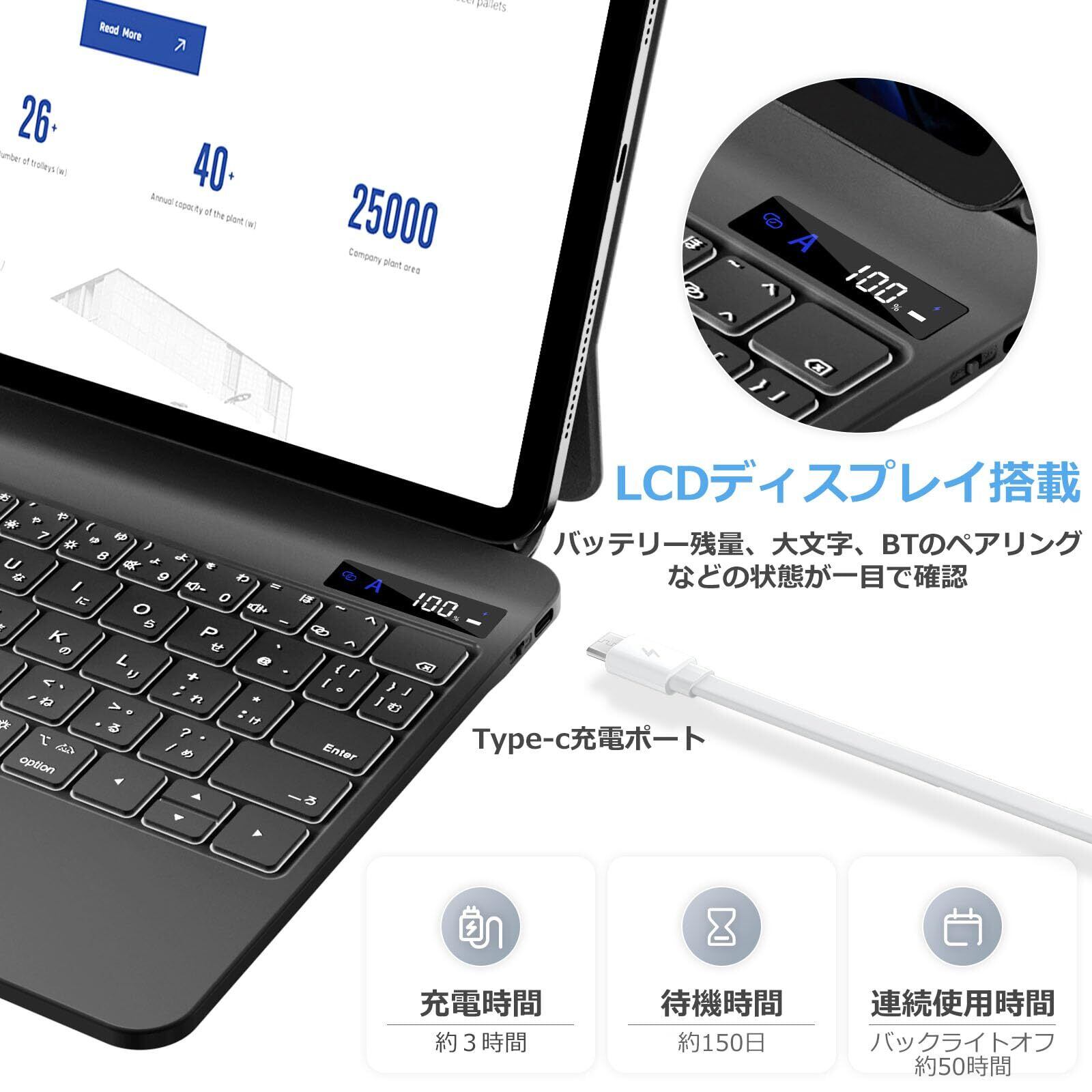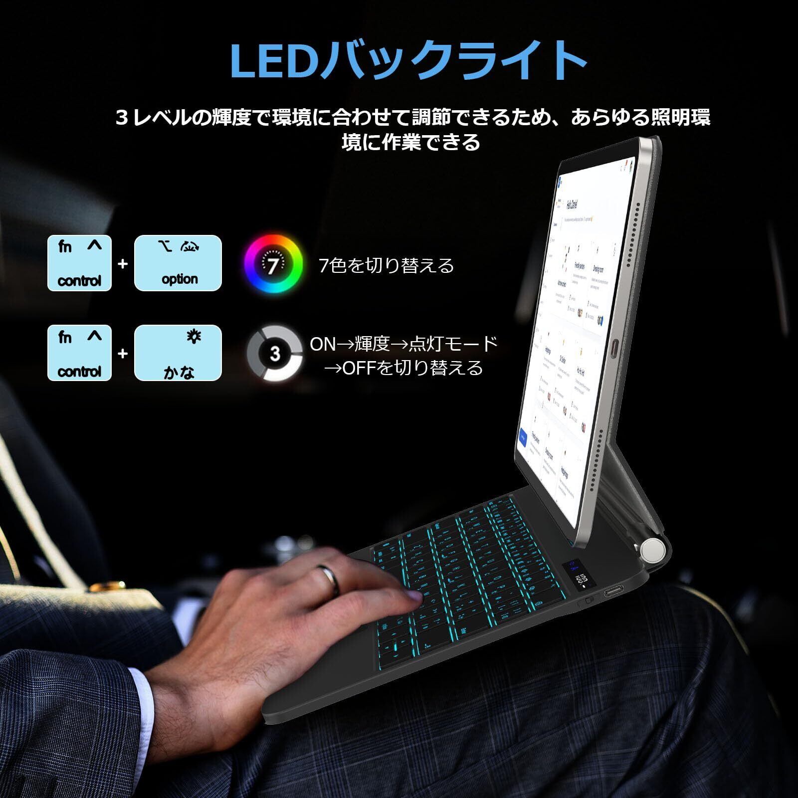 マジックキーボード iPad Pro 11 インチ M4/M5 モデル番号(A2836 A2837 A3006/A3357 A3358 A3359)に適用 iPadキーボード付きケース 高精度トラックパッド付き 日本語配列 ファクションキー配列 LCDディスプレ 7色バックライト 磁気吸着ケース 角度調整可能 横置きスタンド ブラック