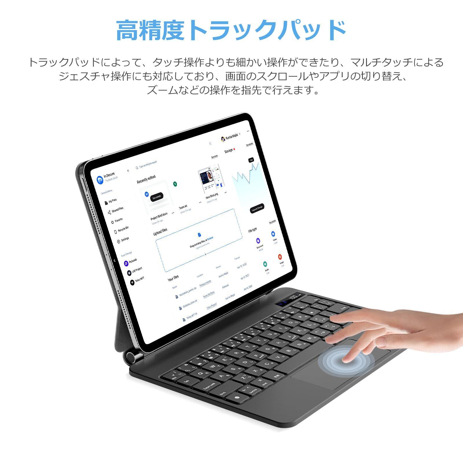 【ノートPCのように快適タイピングできる】一体型の設計であり、キーボードを開くだけでiPadをノートPCのように使うことができます。トラックパッドによって、タッチ操作よりも細かい操作ができたり、マルチタッチによるジェスチャ操作にも対応しており、画面のスクロールやアプリの切り替え、ズームなどの操作を指先で行え、より便利に使えます。1㎜シザーメカニズム、18mmのキーピッチを採用しており、毎回完璧な弾みを実現し、高速かつ精確なタイピングを可能にします。